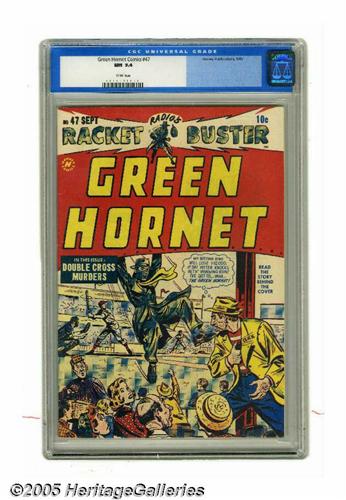 <B>Green Hornet Comics #47 (Harvey, 1949) CGC NM 9.4 White pages.</B></I> This issue was the last of the title's run. Its baseball-themed cover looks like the work of Al Avison to us. And a backup feature stars a character whose longevity almost matches the Green Hornet's, namely newspaper strip hero Kerry Drake. Overstreet 2005 NM- 9.2 value = $385. CGC census 2/05: 1 in 9.4, none higher.