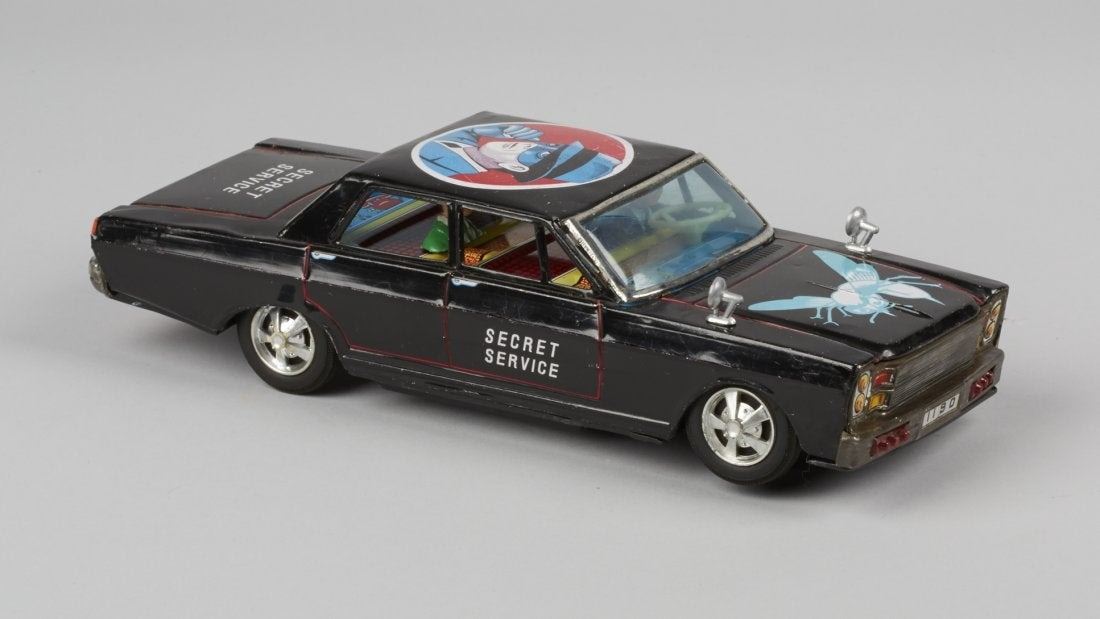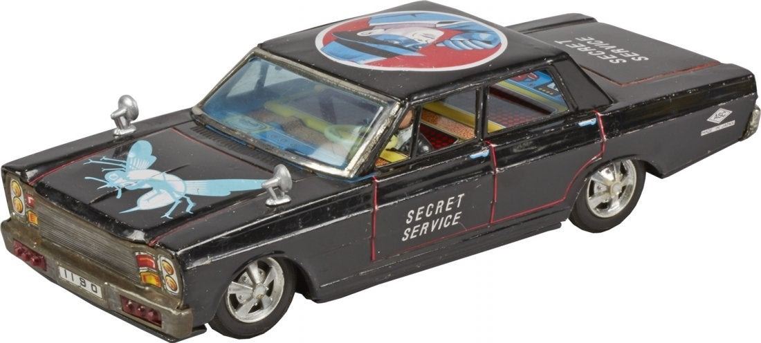 Green Hornet - Secret Service Litho. Tin Car, Made In Japan, c1966, battery op. - 12"l. Makes siren noise, moves, rear tailpipes light-up