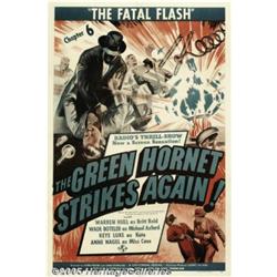 <B>Green Hornet Strikes Again (Universal, 1941)</B></I> One Sheet (27" X 41"). Chapter 6, The Fatal Flash. The Green Hornet aired for the first time on radio in 1936. The premise of the Green Hornet was that of a modern day Lone Ranger. The main character was Britt Reid, a newspaper publisher of the Daily Sentinel by day and the Green Hornet by night. Britt Reid was supposed to be the great-nephew of the Lone Ranger. Offered here is a chapter sheet to the second serial made from the radio show. As always with Universal they would print an entirely different poster for each chapter in duo-tone colors. This poster was in very nice shape prior to linen backing. It has had minimal fold line touchup and a small chip out of the upper border replaced. Very Fine on Linen.