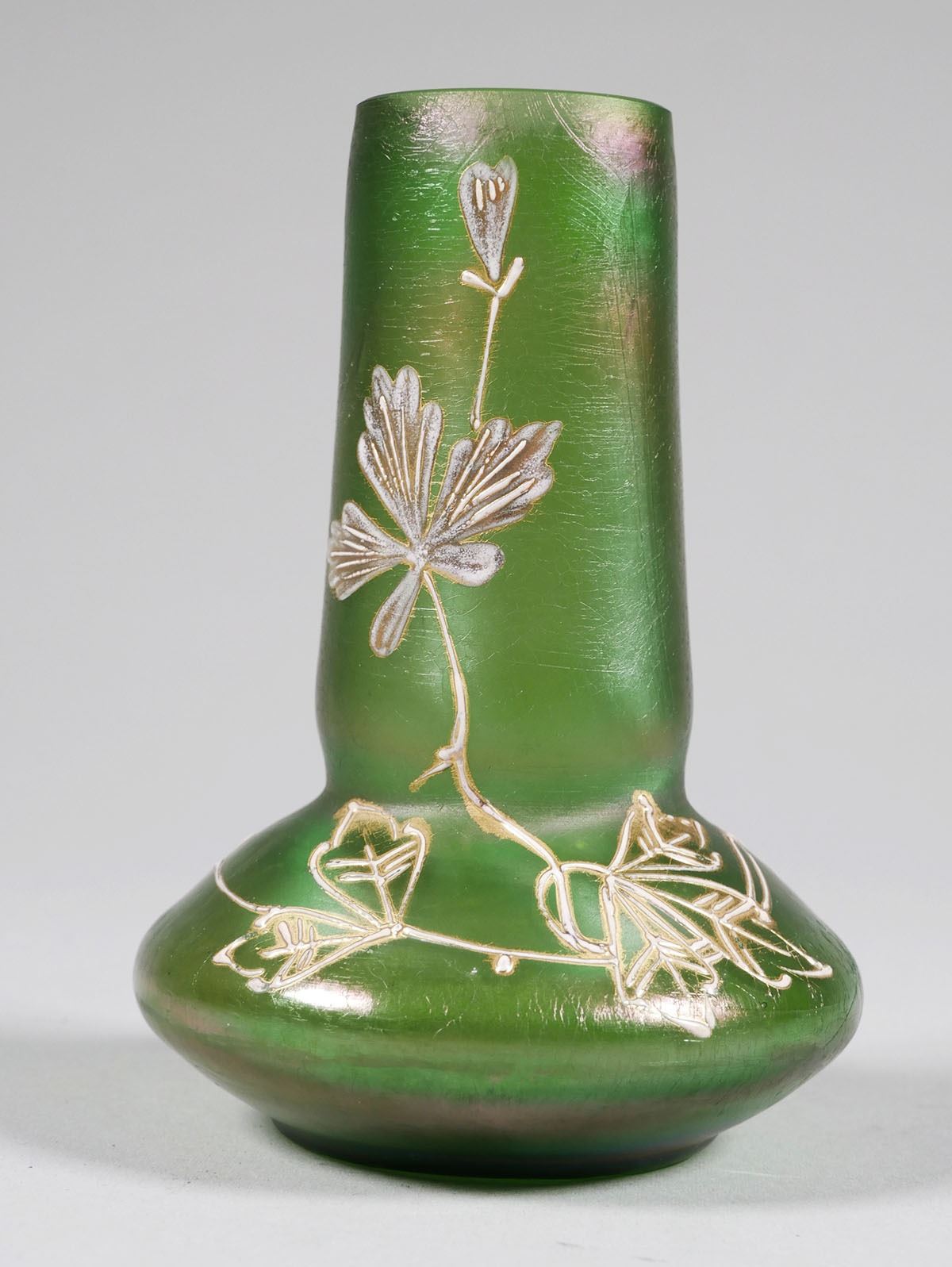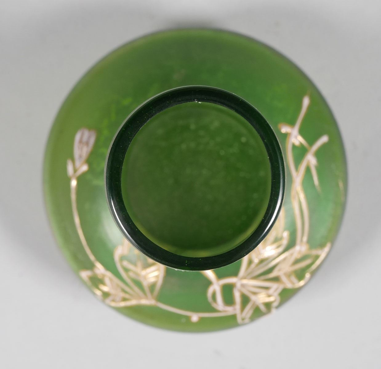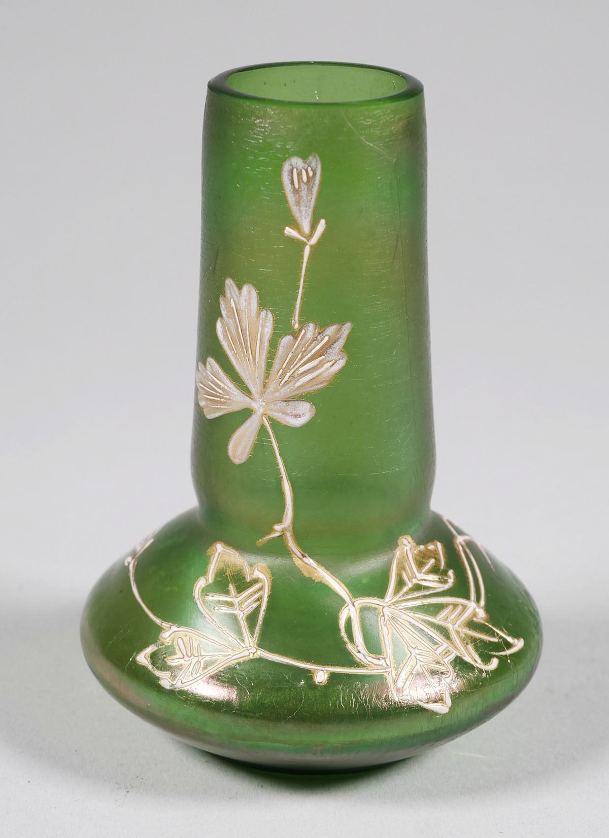 French enamel glass vase. Iridescent green with gilt enamel overlay floral design. Loetz style, unsigned. Measures 4 1/2" tall. Excellent condition with no chips, cracks or damage.