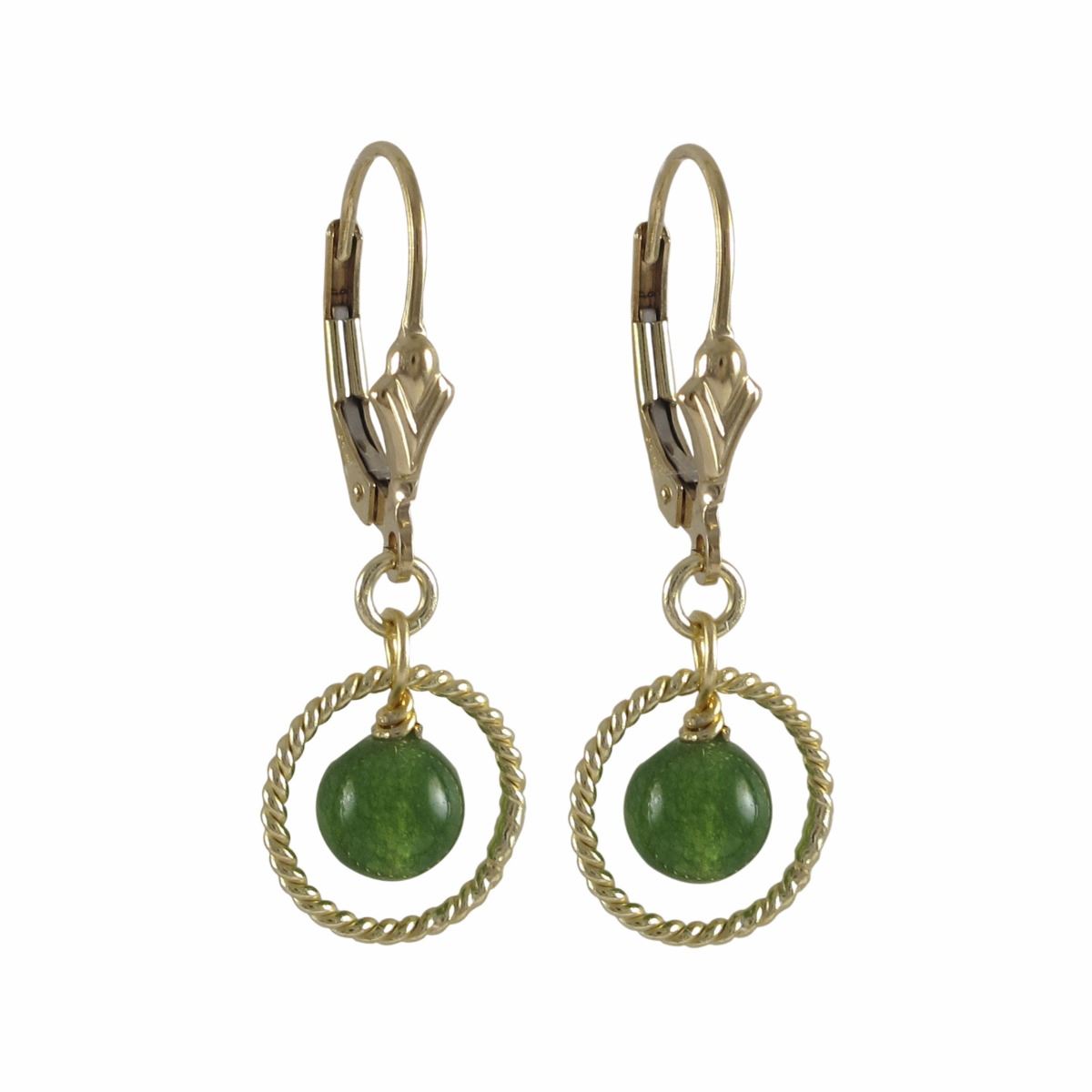 Green Jade 6Mm Semi Precious Ball In 10Mm Braided Ring, On Gold Filled Lever Back Earrings, 1.18"