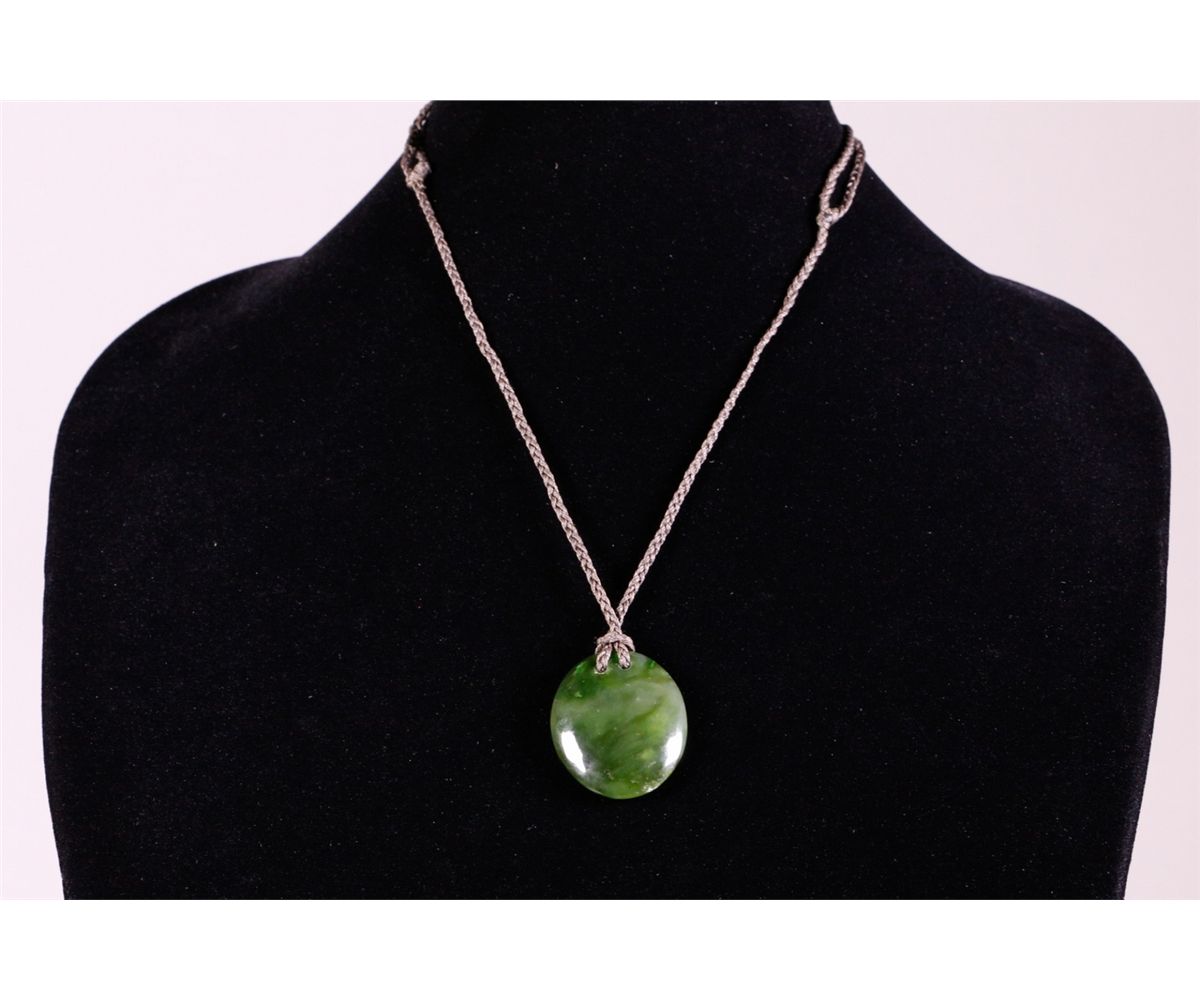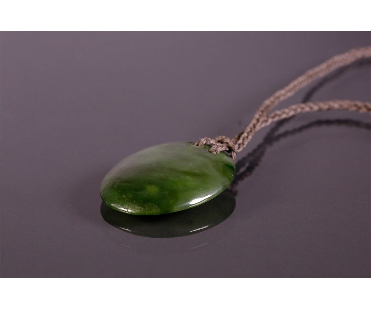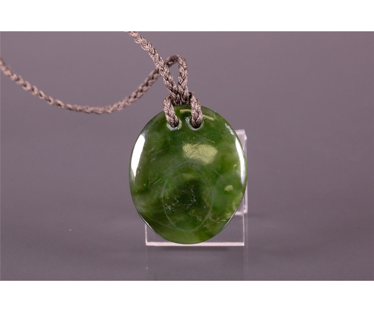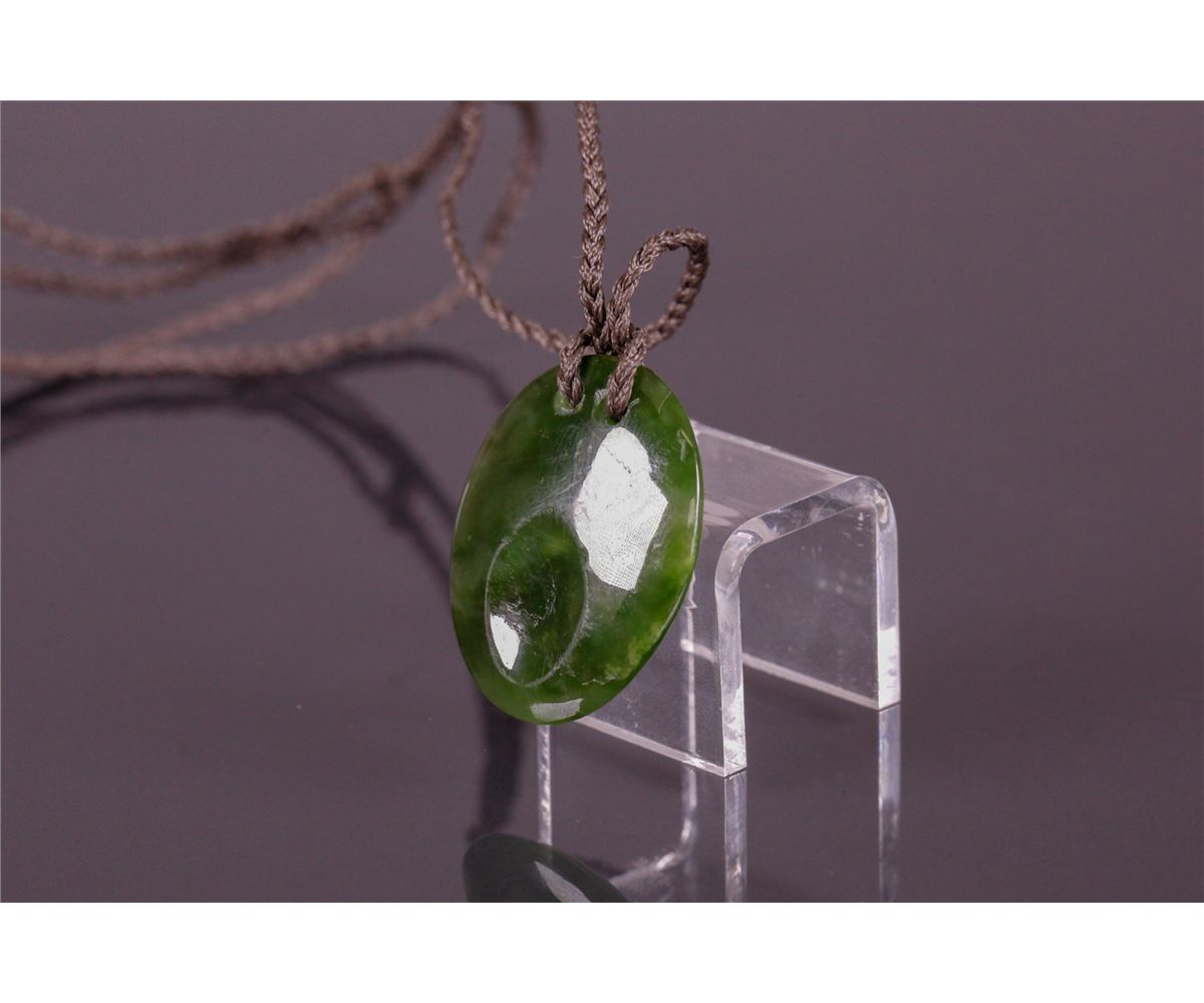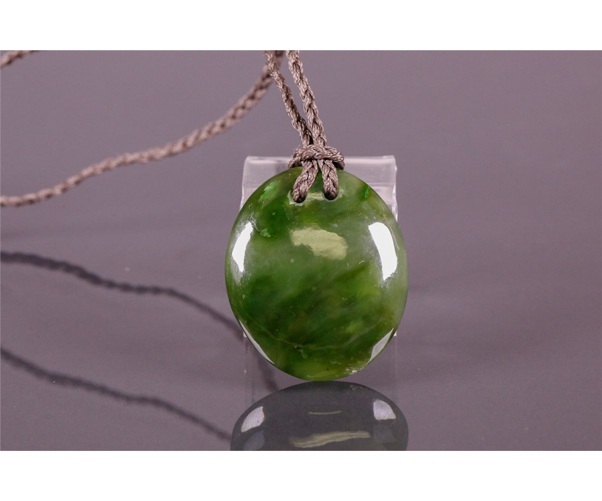Premium hand carved top grade green jade dimpled oval pebble pendant. 35 x 27 mm and 5 mm thick. 15 grams. Adjustable hand braided waxed cord.