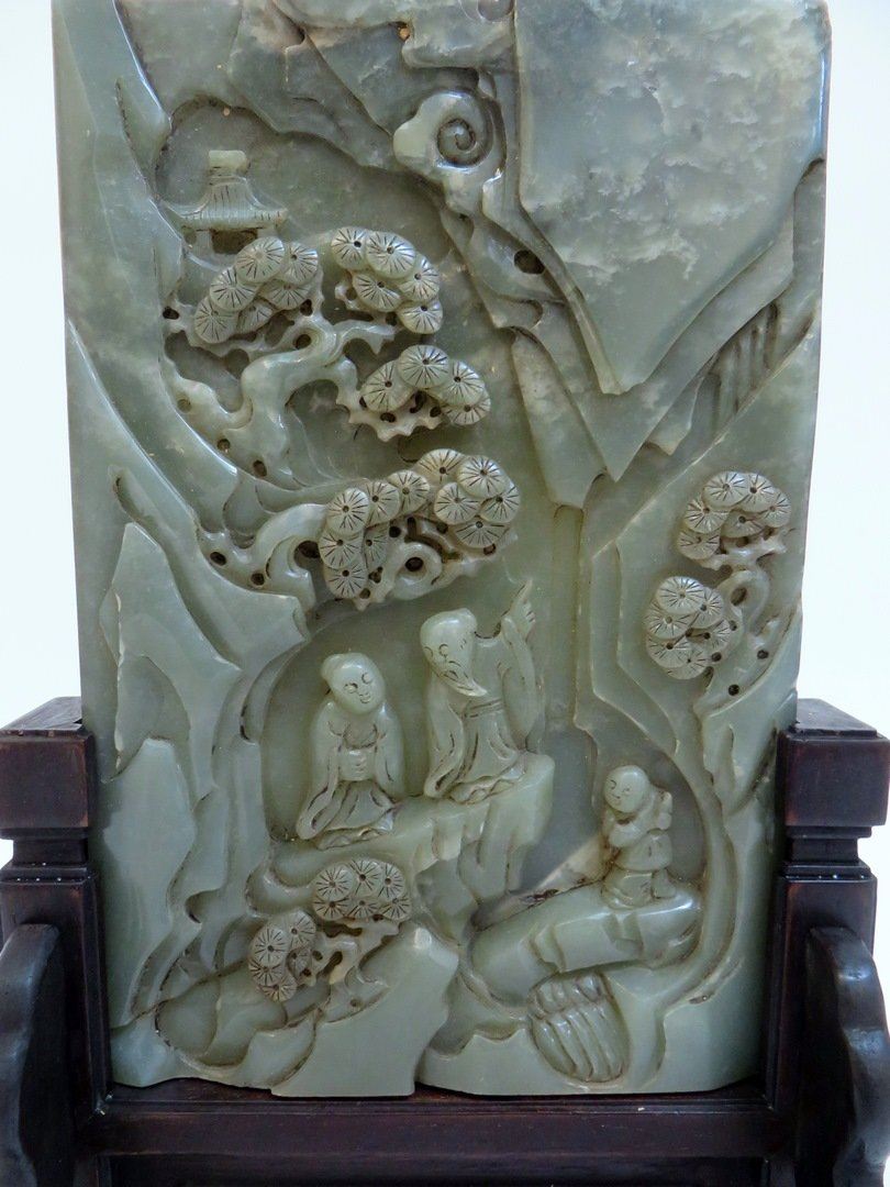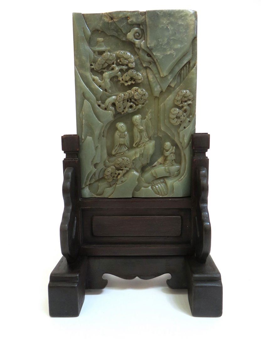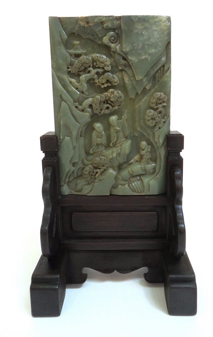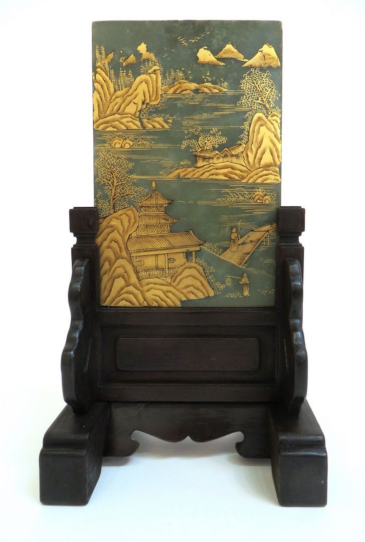 A miniature table screen with a solid jade insert, the front side depicting a carved scene with figures in landscape, the reverse side with pen and ink on gold leaf with a of a sweeping water-landscape. Some wear of gilt surface on the edges. NO RESERVE! ! Most items in this sale have no reserve