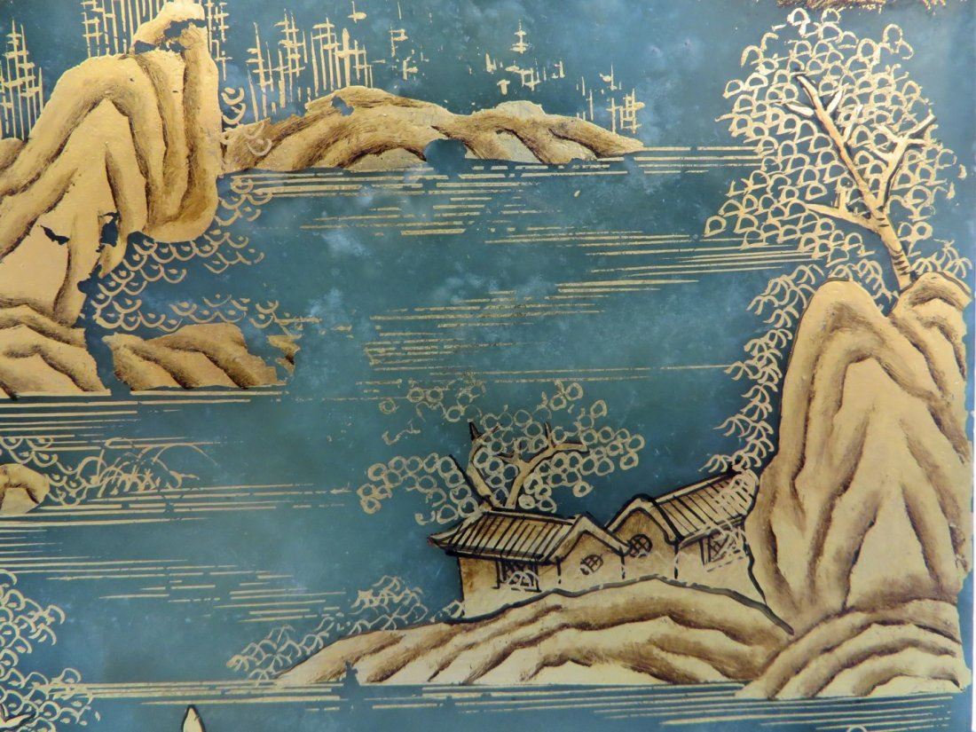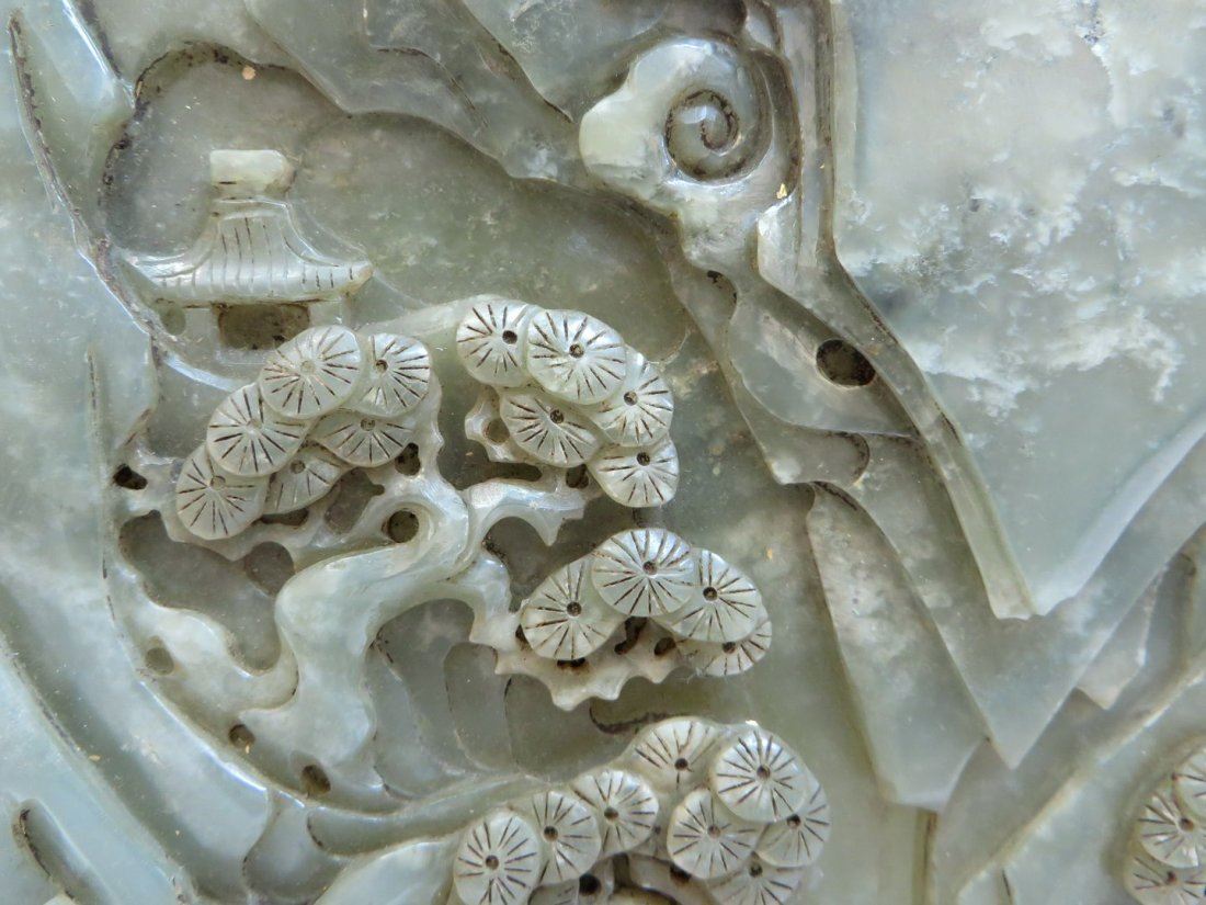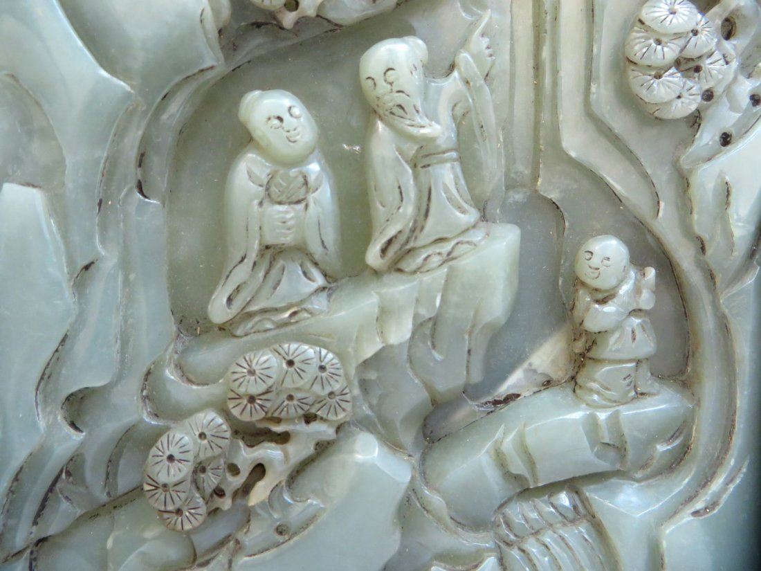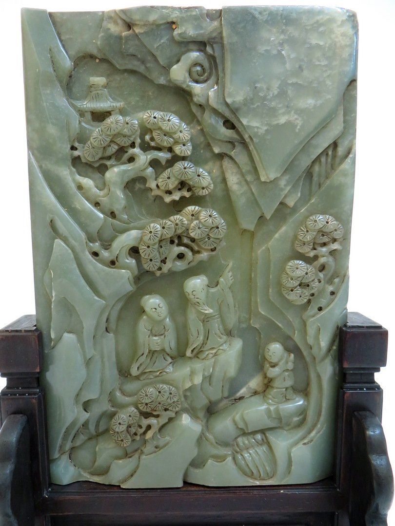 A miniature table screen with a solid jade insert, the front side depicting a carved scene with figures in landscape, the reverse side with pen and ink on gold leaf with a of a sweeping water-landscape. Some wear of gilt surface on the edges. NO RESERVE! ! Most items in this sale have no reserve