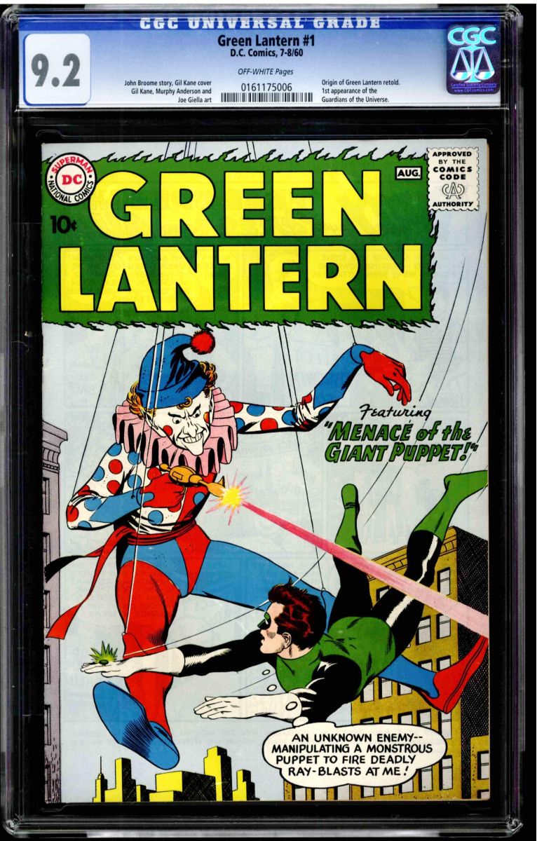 Green Lantern #1 CGC 9.2 off white pages. "Planet Of The Doomed Men" - Written by John Broome, edited by Julius Schwartz, art by Gil Kane, cover by Gil Kane and Joe Giella. First issue of Green Lantern's own title in the Silver Age, July/August 1960. Overstreet 2009 NM 9.2 value = $9,500. The CGC universal census reports 2 at 9.2 and 1 higher. This is your chance to own a piece of history with one of the 4 best copies of this book. Remember this copy has never been pressed.