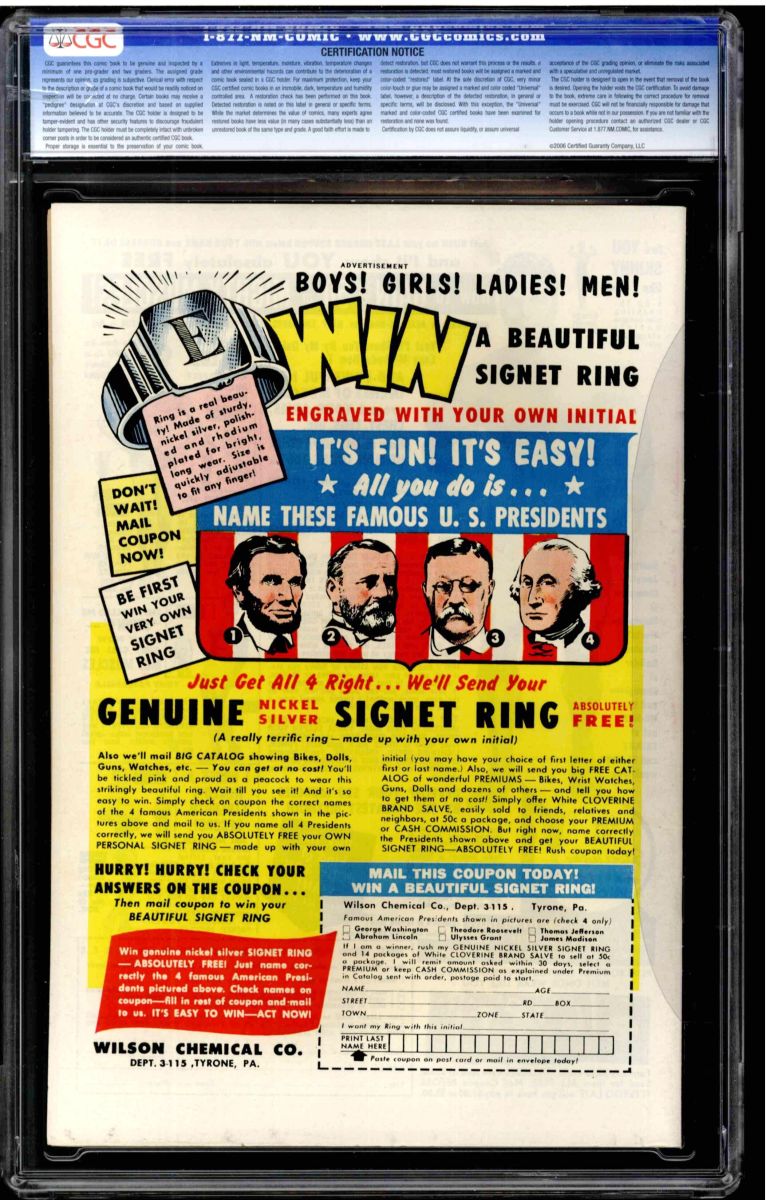 The Auctioneer has reserved the right to reject any and all bids, and to bid at the auction. Auctioneers Auctions are not on approval. Auctioneer does not allow certified material to be returned because of possible differences of opinion with respect to the grade offered by any third party organization, dealer, or service. Absolutely no guarantee of grade is offered for un-certified property sold and subsequently submitted to a third-party grading service. There will be no exceptions to this policy. Under extremely limited circumstances, (e.g. gross cataloging error) a purchaser, who did not bid from the floor, may request Auctioneer to evaluate voiding a sale; such request must be made in writing detailing the alleged gross error, and submission of the lot to the Auctioneer must be pre-approved by the Auctioneer. Bidder must notify Auctioneer in writing of such request within three (3) days of the non-floor bidder receipt of the lot. Any lot that is to be evaluated must be in our offices within 30 days after Auction. Grading does not qualify for this evaluation process nor do such complaints constitute a basis to challenge the authenticity of a lot. AFTER THAT 30-DAY PERIOD, NO LOTS MAY BE RETURNED FOR REASONS OTHER THAN AUTHENTICITY. Lots returned must be housed intact in the original holder. No lots purchased by floor Bidders may be returned (including those Bidders acting as agents for others). Late remittance for purchases may be considered just cause to revoke all return privileges. B: Auctions conducted solely on the Internet have a THREE (3) DAY RETURN POLICY: Lots paid for within seven days of the Auction closing are sold with a three (3) day return privilege. You may return lots under the following conditions: Within three days of receipt of the lot, you must first notify Auctioneer by contacting Client Service by phone (314-680-8599) or e-mail (moundcityauctions@gmail.com), and immediately mail the lot(s) fully insured to the attention of Returns, Mound City Auctions 1081 Teson Rd. Hazelwood, MO. 63042. Lots must be housed intact in their original holder and in their original condition. You are responsible for the insured, safe delivery of any lots. Auctioneer will not be responsible for lots returned in non-registered mail or lots returned without prior authorization per section B. A non-negotiable return fee of 5% of the purchase price ($10 per lot minimum) will be deducted from the refund for each returned lot or billed directly. Postage and handling fees are not refunded. After the three-day period (from receipt), no items may be returned for any reason. Late remittance for purchases revokes all Return-Restock privileges. C: Bidders who have inspected the lots prior to the auction will not be granted any return privileges. D: Comic books sold referencing a third-party grading service are sold “as is” without any express or implied warranty. Certain warranties may be available from the grading services and the Bidder is referred to them for further details: Certified Guaranty Company, LLC. (CGC), P.O. Box 4738, Sarasota, FL 34230. E: Bidders who intend to challenge authenticity or provenance of a lot must notify Auctioneer in writing within thirty (30) days of the Auctions conclusion. In the event Auctioneer cannot deliver the lot or subsequently it is established that the lot lacks title, provenance, authenticity, or other transfer or condition issue is claimed, Auctioneer's liability shall be limited to rescission of sale and refund of purchase price; in no case shall Auctioneer's maximum liability exceed the high bid on that lot, which bid shall be deemed for all purposes the value of the lot. After one year has elapsed, Auctioneer's maximum liability shall be limited to any commissions and fees Auctioneer earned on that lot. F: All comics are guaranteed genuine, but are not guaranteed as to grade, since grading is a matter of opinion, an art and not a science, and therefore the opinion rendered by the Auctioneer or any third party grading service may not agree with the opinion of others (including trained experts), and the same expert may not grade the same item with the same grade at two different times. G: Since we cannot examine encapsulated comics, they are sold “as is”without our grading opinion, and may not be returned for any reason. Auctioneer shall not be liable for any patent or latent defect or controversy pertaining to or arising from any encapsulated collectible. In any such instance, purchaser's remedy, if any, shall be solely against the service certifying the collectible. H: Due to changing grading standards over time, differing interpretations, and to possible mishandling of items by subsequent owners, Auctioneer reserves the right to grade items differently than shown on certificates from any grading service that accompany the items. Auctioneer also reserves the right to grade items differently than the grades shown in the prior catalog should such items be reconsigned to any future auction. I: Although consensus grading is employed by most grading services, it should be noted as aforesaid that grading is not an exact science. In fact, it is entirely possible that if a lot is broken out of a plastic holder and resubmitted to another grading service or even to the same service, the lot could come back with a different grade assigned. J: Certification does not guarantee protection against the normal risks associated with potentially volatile markets. The degree of liquidity for certified collectibles will vary according to general market conditions and the particular lot involved. For some lots there may be no active market at all at certain points in time."