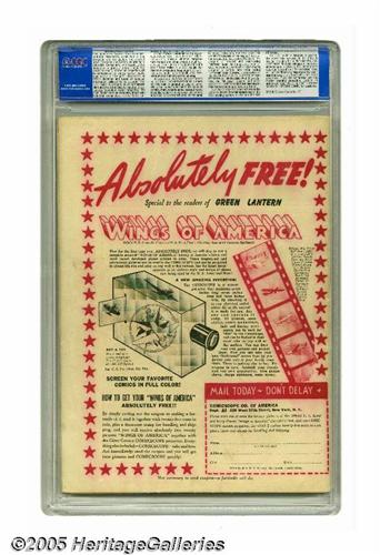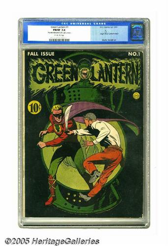 <B>Green Lantern #1 (DC, 1941) CGC FN/VF 7.0 Off-white pages.</B></I> This issue's one of the most valuable DC comics. In fact, it's listed among the 20 most valuable comic books of all by Overstreet. This issue's story retells the origin of Alan Scott, the Golden Age GL, for kids who might have missed his earliest appearances in the pages of <B>All-American Comics</B></I>. GL's creator Martin Nodell drew the stories, Bill Finger supplied the scripts, and the cover is by Howard Purcell. CGC notes, "Very minor amount of color touch on cover." Overstreet 2005 FN 6.0 value = $8,925; VF 8.0 value = $23,800. CGC census 6/05: 5 in 7.0, 7 higher.