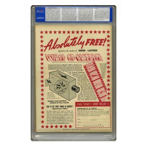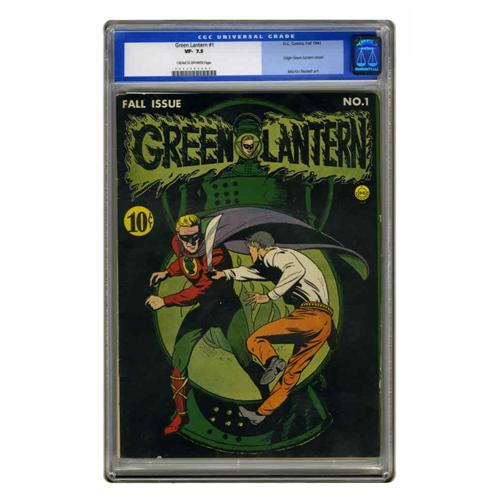 <B>Green Lantern #1 (DC, 1941) CGC VF- 7.5 Cream to off-white pages.</B></I> After starring in <B>All-American Comics</B></I> for a year, Green Lantern was given his own series starting with this issue, which is currently ranked among the 20 most valuable comic books by Overstreet. It seems there might not be any top-grade copies of this book -- the highest-graded in CGC's census is only a 9.0, putting this one among the top handful available. The issue has a Howard Purcell cover, with interior art by the character's creator, Mart Nodell. Overstreet 2005 VF 8.0 value = $23,800. CGC census 110/05: 2 in 7.5, 5 higher.