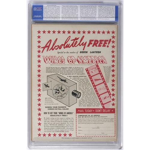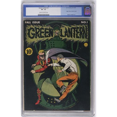 <B>Green Lantern #1 (DC, 1941) CGC VF- 7.5 Cream to off-white pages.</B></I> After starring in <B>All-American Comics</B></I> for a year, Green Lantern was given his own series starting with this issue, which is currently ranked among the 20 most valuable comic books by Overstreet. It seems there might not be any top-grade copies of this book -- the highest-graded in CGC's census is only a 9.0, putting this one among the top handful available. The issue has a Howard Purcell cover, with interior art by the character's creator, Mart Nodell. Overstreet 2006 VF 8.0 value = $24,000. CGC census 03/06: 2 in 7.5, 5 higher.
