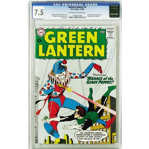 <B>Green Lantern #1 (DC, 1960) CGC VF- 7.5 Off-white to white pages.</B></I> This first (and most valuable) issue of the series features the first appearance of the Guardians of the Universe. Gil Kane handled the cover and interior art. Overstreet 2006 VF 8.0 value = $3,065. CGC census 3/06: 8 in 7.5, 23 higher.
