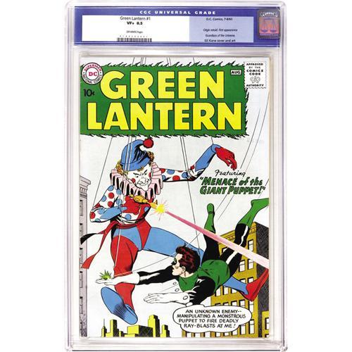 <B>Green Lantern #1 (DC, 1960) CGC VF+ 8.5 Off-white pages.</B></I> The first issue of Green Lantern's own series (following his debut in <B>Showcase</B></I> #22-24) had the first appearance of those follicly challenged sages, the Guardians of the Universe, a key component of the whole Green Lantern mythos. Also, the Silver Age hero's origin is retold here. Gil Kane handled the cover and interior art. Overstreet 2006 VF 8.0 value = $3,065; VF/NM 9.0 value = $5,383. CGC census 6/06: 6 in 8.5, 7 higher. <BR><BR><B>Important notice:</B> Heritage usually auctions material at the rate of 200-250 lots per hour. On some occasions eBay Live bid software or the Internet may not be able to keep up with the pace of the auction. We recommend placing a realistic absentee bid now as insurance to avoid disappointment. Occasionally the auctioneer may eliminate or reject an eBay Live bid, and the auctioneer may also reopen a lot after the close of the eBay live bidding (usually because we missed an audience bid), and may reject your bid even if it shows you as the winning bidder. By bidding via eBay Live, you agree that Heritage may award the lot to another bidder at its sole discretion under the circumstances described above or any other reasonable circumstances. Since eBay bids are not shown to us until we open the lot on the floor, we treat those bids just like floor bids. In most cases the floor responds before the eBay bid is presented to us, due to Internet lag time, so for consistency we have made it a policy that floor bids are always considered first over tie eBay live bids. Also please note that all Heritage lots purchased through eBay Live carry a 22.5% Buyer's Premium. Please make sure you read the Terms and Conditions before you bid. This lot is being auctioned in conjunction with a live floor auction by Heritage Auction Galleries. All final auction and invoice information will be supplied by Heritage Auction Galleries, and all other information should be considered preliminary. Lot:41001 <BR><BR><B>Winning Notification and Billing:</B> After the FINAL session in this auction is complete, Heritage will send e-mail and snail mail invoices. This process normally takes several days. All final auction and invoice information will be supplied by Heritage Auction Galleries, and all other information should be considered preliminary. <BR><BR>This auction will be conducted on a live auction floor and over the Internet through eBay Live. If you choose to place an absentee bid, please take a moment to <font color='#0000ff'><u><a href='http://pages.ebay.com/liveauctions/help/before/laabsentee.html'>learn how eBay Live absentee bidding works</a></u></font><font color='#000000'>