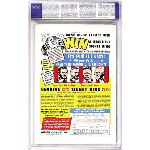 50. Since we cannot examine encapsulated notes or comics, they are sold "as is" without our grading opinion, and may not be returned for any reason. Auctioneer shall not be liable for any patent or latent defect or controversy pertaining to or arising from any encapsulated collectible. In any such instance, purchaser's remedy, if any, shall be solely against the service certifying the collectible.
