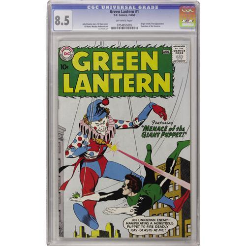 <B>Green Lantern #1 (DC, 1960) CGC VF+ 8.5 Off-white pages.</B></I> As many a collector have discovered, it's one thing to find Silver Age Marvels in high grade and a tougher chore to unearth nice DC keys like this one. Green Lantern got his own series after debuting in <B>Showcase</B></I> #22-24, and amazingly, it wasn't until this fourth story that the Guardians of the Universe first appeared. What would the Green Lantern saga be without those bald fellows from Oa? Also, for anyone who missed the <B>Showcase</B></I> books, GL's origin was helpfully retold here. Gil Kane handled the cover and interior art. Overstreet 2006 VF 8.0 value = $3,065; VF/NM 9.0 value = $5,383. CGC census 10/06: 6 in 8.5, 7 higher.<BR><BR><b>Shipping:</b> Slabbed Comic (<a target="_blank" href="http://www.heritageauctions.com/common/shipping.php">view shipping information</a>)