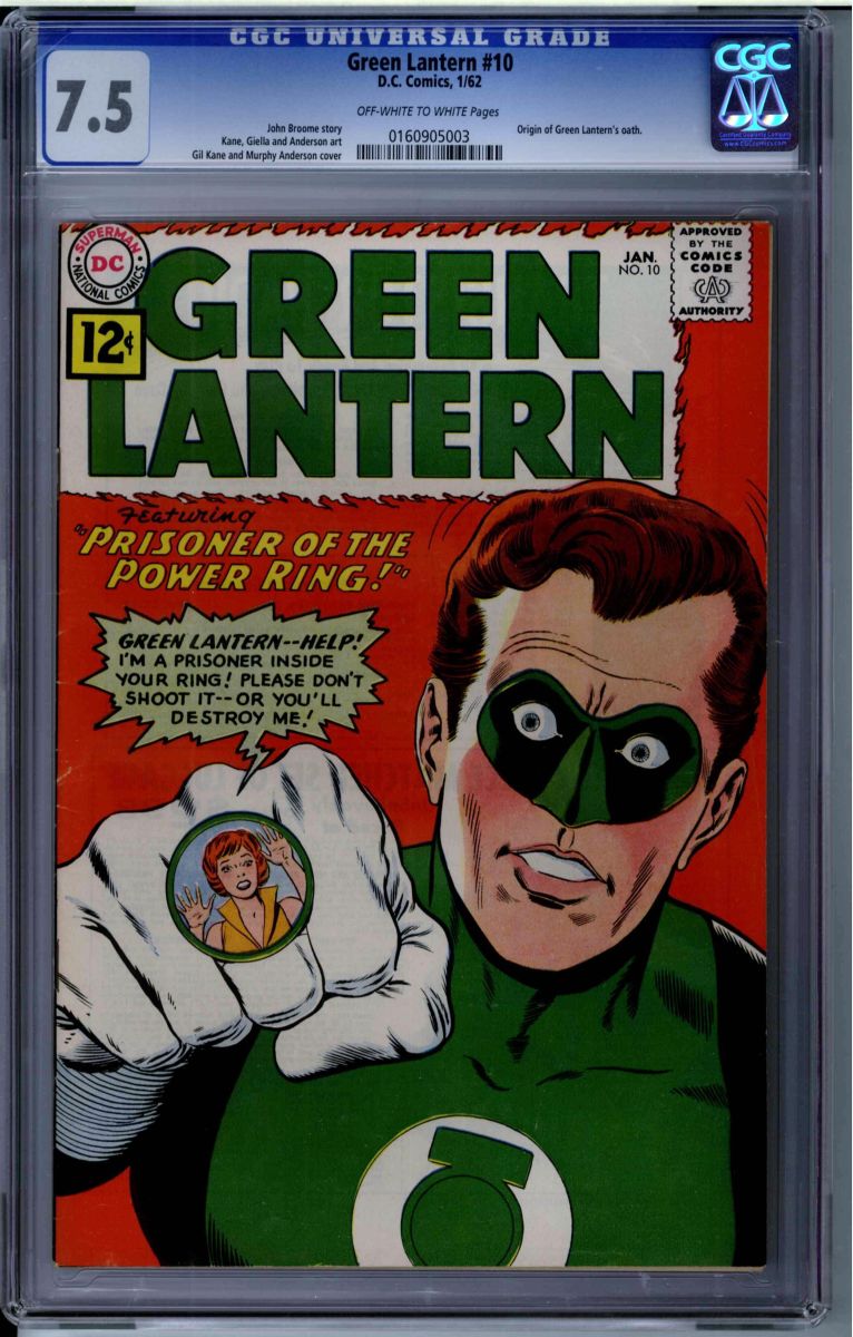 Green Lantern #10 CGC 7.5 off-white to white pages. cover by Murphy Anderson and Gil Kane. January 1962. Overstreet 2009 FN 6.0 value = $78; VF 8.0 value = $13 The CGC universal census reports 2 at 7.5 and 11 higher.