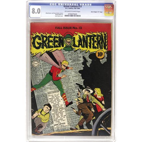 <B>Green Lantern #13 Davis Crippen ("D" Copy) pedigree (DC, 1944) CGC VF 8.0 Off-white to white pages.</B></I> Irwin Hasen is credited with this issue's cover, while Green Lantern's creator Martin Nodell supplied the interior art. Overstreet 2006 VF 8.0 value = $963. CGC census 7/06: 1 in 8.0, none higher. <I>From the Crippen Collection.</B></I> <BR><BR><B>Important notice:</B> Heritage usually auctions material at the rate of 200-250 lots per hour. On some occasions eBay Live bid software or the Internet may not be able to keep up with the pace of the auction. We recommend placing a realistic absentee bid now as insurance to avoid disappointment. Occasionally the auctioneer may eliminate or reject an eBay Live bid, and the auctioneer may also reopen a lot after the close of the eBay live bidding (usually because we missed an audience bid), and may reject your bid even if it shows you as the winning bidder. By bidding via eBay Live, you agree that Heritage may award the lot to another bidder at its sole discretion under the circumstances described above or any other reasonable circumstances. Since eBay bids are not shown to us until we open the lot on the floor, we treat those bids just like floor bids. In most cases the floor responds before the eBay bid is presented to us, due to Internet lag time, so for consistency we have made it a policy that floor bids are always considered first over tie eBay live bids. Also please note that all Heritage lots purchased through eBay Live carry a 22.5% Buyer's Premium. Please make sure you read the Terms and Conditions before you bid. This lot is being auctioned in conjunction with a live floor auction by Heritage Auction Galleries. All final auction and invoice information will be supplied by Heritage Auction Galleries, and all other information should be considered preliminary. Lot:41001 <BR><BR><B>Winning Notification and Billing:</B> After the FINAL session in this auction is complete, Heritage will send e-mail and snail mail invoices. This process normally takes several days. All final auction and invoice information will be supplied by Heritage Auction Galleries, and all other information should be considered preliminary. <BR><BR>This auction will be conducted on a live auction floor and over the Internet through eBay Live. If you choose to place an absentee bid, please take a moment to <font color='#0000ff'><u><a href='http://pages.ebay.com/liveauctions/help/before/laabsentee.html'>learn how eBay Live absentee bidding works</a></u></font><font color='#000000'>