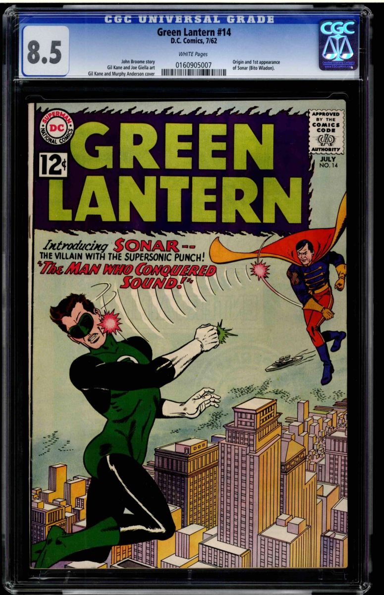 Green Lantern #14 CGC 8.5 white pages. "The Man Who Conquered Sound" Written by John Broome, art by Gil Kane. Cover by Murphy Anderson and Gil Kane. July 1962. Origin and 1st appearance of Sonar (Bito Wladon). Overstreet 2009 VF 8.0 value = $111; VF/NM 9.0 value = $206. The CGC universal census reports 2 at 8.5 and 6 higher.