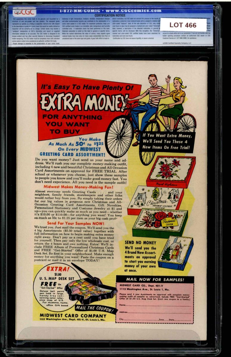 The Auctioneer has reserved the right to reject any and all bids, and to bid at the auction. Auctioneers Auctions are not on approval. Auctioneer does not allow certified material to be returned because of possible differences of opinion with respect to the grade offered by any third party organization, dealer, or service. Absolutely no guarantee of grade is offered for un-certified property sold and subsequently submitted to a third-party grading service. There will be no exceptions to this policy. Under extremely limited circumstances, (e.g. gross cataloging error) a purchaser, who did not bid from the floor, may request Auctioneer to evaluate voiding a sale; such request must be made in writing detailing the alleged gross error, and submission of the lot to the Auctioneer must be pre-approved by the Auctioneer. Bidder must notify Auctioneer in writing of such request within three (3) days of the non-floor bidder receipt of the lot. Any lot that is to be evaluated must be in our offices within 30 days after Auction. Grading does not qualify for this evaluation process nor do such complaints constitute a basis to challenge the authenticity of a lot. AFTER THAT 30-DAY PERIOD, NO LOTS MAY BE RETURNED FOR REASONS OTHER THAN AUTHENTICITY. Lots returned must be housed intact in the original holder. No lots purchased by floor Bidders may be returned (including those Bidders acting as agents for others). Late remittance for purchases may be considered just cause to revoke all return privileges. B: Auctions conducted solely on the Internet have a THREE (3) DAY RETURN POLICY: Lots paid for within seven days of the Auction closing are sold with a three (3) day return privilege. You may return lots under the following conditions: Within three days of receipt of the lot, you must first notify Auctioneer by contacting Client Service by phone (314-680-8599) or e-mail (moundcityauctions@gmail.com), and immediately mail the lot(s) fully insured to the attention of Returns, Mound City Auctions 1081 Teson Rd. Hazelwood, MO. 63042. Lots must be housed intact in their original holder and in their original condition. You are responsible for the insured, safe delivery of any lots. Auctioneer will not be responsible for lots returned in non-registered mail or lots returned without prior authorization per section B. A non-negotiable return fee of 5% of the purchase price ($10 per lot minimum) will be deducted from the refund for each returned lot or billed directly. Postage and handling fees are not refunded. After the three-day period (from receipt), no items may be returned for any reason. Late remittance for purchases revokes all Return-Restock privileges. C: Bidders who have inspected the lots prior to the auction will not be granted any return privileges. D: Comic books sold referencing a third-party grading service are sold “as is” without any express or implied warranty. Certain warranties may be available from the grading services and the Bidder is referred to them for further details: Certified Guaranty Company, LLC. (CGC), P.O. Box 4738, Sarasota, FL 34230. E: Bidders who intend to challenge authenticity or provenance of a lot must notify Auctioneer in writing within thirty (30) days of the Auctions conclusion. In the event Auctioneer cannot deliver the lot or subsequently it is established that the lot lacks title, provenance, authenticity, or other transfer or condition issue is claimed, Auctioneer's liability shall be limited to rescission of sale and refund of purchase price; in no case shall Auctioneer's maximum liability exceed the high bid on that lot, which bid shall be deemed for all purposes the value of the lot. After one year has elapsed, Auctioneer's maximum liability shall be limited to any commissions and fees Auctioneer earned on that lot. F: All comics are guaranteed genuine, but are not guaranteed as to grade, since grading is a matter of opinion, an art and not a science, and therefore the opinion rendered by the Auctioneer or any third party grading service may not agree with the opinion of others (including trained experts), and the same expert may not grade the same item with the same grade at two different times. G: Since we cannot examine encapsulated comics, they are sold “as is”without our grading opinion, and may not be returned for any reason. Auctioneer shall not be liable for any patent or latent defect or controversy pertaining to or arising from any encapsulated collectible. In any such instance, purchaser's remedy, if any, shall be solely against the service certifying the collectible. H: Due to changing grading standards over time, differing interpretations, and to possible mishandling of items by subsequent owners, Auctioneer reserves the right to grade items differently than shown on certificates from any grading service that accompany the items. Auctioneer also reserves the right to grade items differently than the grades shown in the prior catalog should such items be reconsigned to any future auction. I: Although consensus grading is employed by most grading services, it should be noted as aforesaid that grading is not an exact science. In fact, it is entirely possible that if a lot is broken out of a plastic holder and resubmitted to another grading service or even to the same service, the lot could come back with a different grade assigned. J: Certification does not guarantee protection against the normal risks associated with potentially volatile markets. The degree of liquidity for certified collectibles will vary according to general market conditions and the particular lot involved. For some lots there may be no active market at all at certain points in time."
