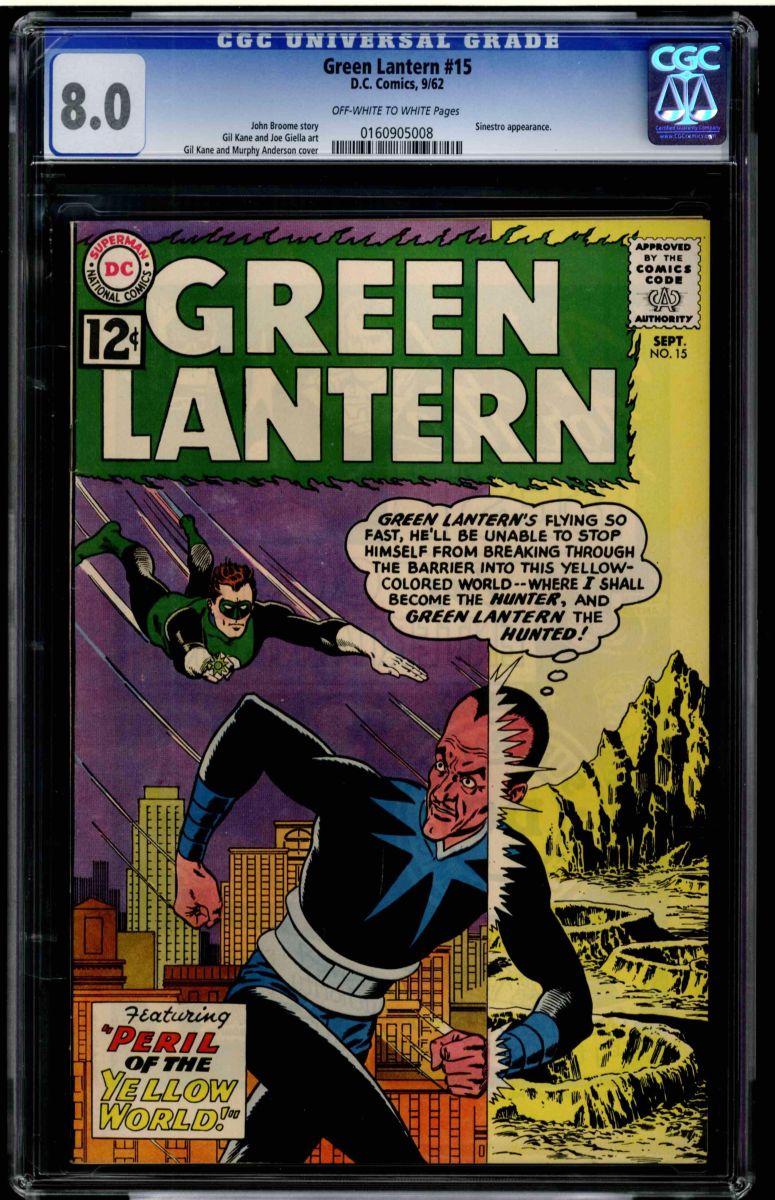 Green Lantern #15 CGC 8.0 off-white to white pages. John Broome story, Gil Kane and Murphy Anderson cover, Kane and Giella art. "Peril Of The Yellow World" Written by John Broome, art by Gil Kane. Overstreet 2009 VF 8.0 value = $111 The CGC universal census reports 5 at 8.0, and 14 higher.