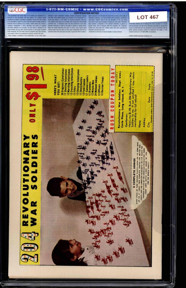 The Auctioneer has reserved the right to reject any and all bids, and to bid at the auction. Auctioneers Auctions are not on approval. Auctioneer does not allow certified material to be returned because of possible differences of opinion with respect to the grade offered by any third party organization, dealer, or service. Absolutely no guarantee of grade is offered for un-certified property sold and subsequently submitted to a third-party grading service. There will be no exceptions to this policy. Under extremely limited circumstances, (e.g. gross cataloging error) a purchaser, who did not bid from the floor, may request Auctioneer to evaluate voiding a sale; such request must be made in writing detailing the alleged gross error, and submission of the lot to the Auctioneer must be pre-approved by the Auctioneer. Bidder must notify Auctioneer in writing of such request within three (3) days of the non-floor bidder receipt of the lot. Any lot that is to be evaluated must be in our offices within 30 days after Auction. Grading does not qualify for this evaluation process nor do such complaints constitute a basis to challenge the authenticity of a lot. AFTER THAT 30-DAY PERIOD, NO LOTS MAY BE RETURNED FOR REASONS OTHER THAN AUTHENTICITY. Lots returned must be housed intact in the original holder. No lots purchased by floor Bidders may be returned (including those Bidders acting as agents for others). Late remittance for purchases may be considered just cause to revoke all return privileges. B: Auctions conducted solely on the Internet have a THREE (3) DAY RETURN POLICY: Lots paid for within seven days of the Auction closing are sold with a three (3) day return privilege. You may return lots under the following conditions: Within three days of receipt of the lot, you must first notify Auctioneer by contacting Client Service by phone (314-680-8599) or e-mail (moundcityauctions@gmail.com), and immediately mail the lot(s) fully insured to the attention of Returns, Mound City Auctions 1081 Teson Rd. Hazelwood, MO. 63042. Lots must be housed intact in their original holder and in their original condition. You are responsible for the insured, safe delivery of any lots. Auctioneer will not be responsible for lots returned in non-registered mail or lots returned without prior authorization per section B. A non-negotiable return fee of 5% of the purchase price ($10 per lot minimum) will be deducted from the refund for each returned lot or billed directly. Postage and handling fees are not refunded. After the three-day period (from receipt), no items may be returned for any reason. Late remittance for purchases revokes all Return-Restock privileges. C: Bidders who have inspected the lots prior to the auction will not be granted any return privileges. D: Comic books sold referencing a third-party grading service are sold “as is” without any express or implied warranty. Certain warranties may be available from the grading services and the Bidder is referred to them for further details: Certified Guaranty Company, LLC. (CGC), P.O. Box 4738, Sarasota, FL 34230. E: Bidders who intend to challenge authenticity or provenance of a lot must notify Auctioneer in writing within thirty (30) days of the Auctions conclusion. In the event Auctioneer cannot deliver the lot or subsequently it is established that the lot lacks title, provenance, authenticity, or other transfer or condition issue is claimed, Auctioneer's liability shall be limited to rescission of sale and refund of purchase price; in no case shall Auctioneer's maximum liability exceed the high bid on that lot, which bid shall be deemed for all purposes the value of the lot. After one year has elapsed, Auctioneer's maximum liability shall be limited to any commissions and fees Auctioneer earned on that lot. F: All comics are guaranteed genuine, but are not guaranteed as to grade, since grading is a matter of opinion, an art and not a science, and therefore the opinion rendered by the Auctioneer or any third party grading service may not agree with the opinion of others (including trained experts), and the same expert may not grade the same item with the same grade at two different times. G: Since we cannot examine encapsulated comics, they are sold “as is”without our grading opinion, and may not be returned for any reason. Auctioneer shall not be liable for any patent or latent defect or controversy pertaining to or arising from any encapsulated collectible. In any such instance, purchaser's remedy, if any, shall be solely against the service certifying the collectible. H: Due to changing grading standards over time, differing interpretations, and to possible mishandling of items by subsequent owners, Auctioneer reserves the right to grade items differently than shown on certificates from any grading service that accompany the items. Auctioneer also reserves the right to grade items differently than the grades shown in the prior catalog should such items be reconsigned to any future auction. I: Although consensus grading is employed by most grading services, it should be noted as aforesaid that grading is not an exact science. In fact, it is entirely possible that if a lot is broken out of a plastic holder and resubmitted to another grading service or even to the same service, the lot could come back with a different grade assigned. J: Certification does not guarantee protection against the normal risks associated with potentially volatile markets. The degree of liquidity for certified collectibles will vary according to general market conditions and the particular lot involved. For some lots there may be no active market at all at certain points in time."