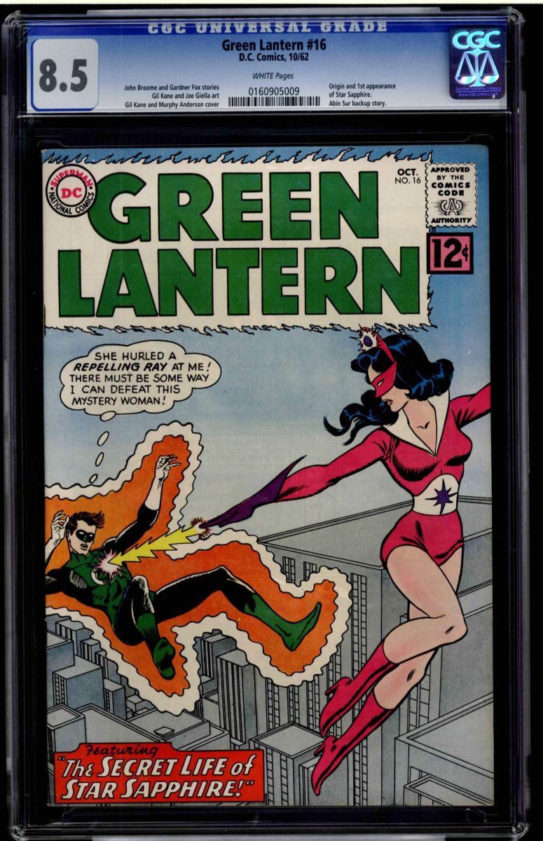 Green Lantern #16 CGC 8.5 white pages. "The Secret Life Of Star Sapphire" Cover by Murphy Anderson and Gil Kane. October 1962. Origin and 1st appearance of Star Sapphire. Overstreet 2009 VF 8.0 value = $111; VF/NM 9.0 value = $206.The CGC universal census reports 8 at 8.5 and 14 higher.