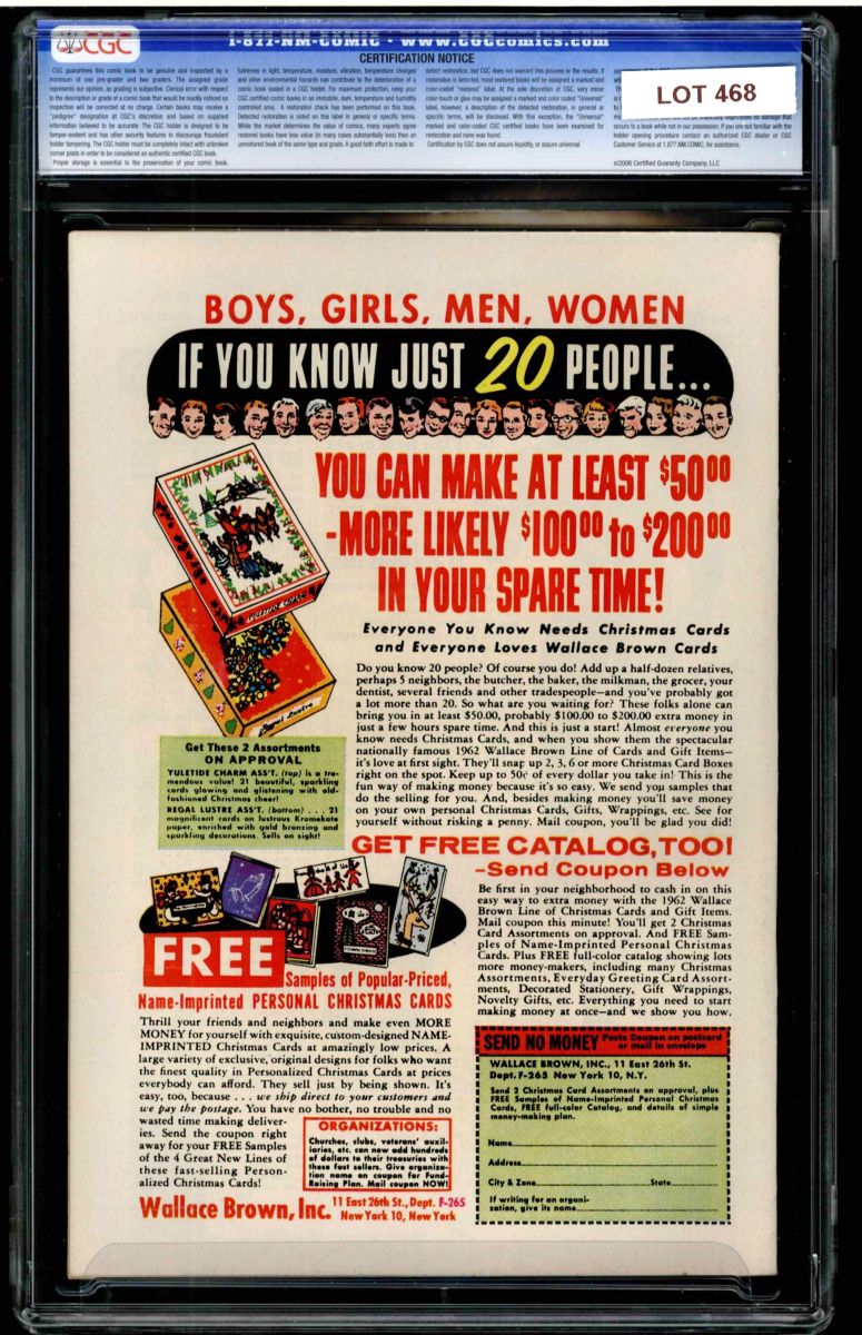 The Auctioneer has reserved the right to reject any and all bids, and to bid at the auction. Auctioneers Auctions are not on approval. Auctioneer does not allow certified material to be returned because of possible differences of opinion with respect to the grade offered by any third party organization, dealer, or service. Absolutely no guarantee of grade is offered for un-certified property sold and subsequently submitted to a third-party grading service. There will be no exceptions to this policy. Under extremely limited circumstances, (e.g. gross cataloging error) a purchaser, who did not bid from the floor, may request Auctioneer to evaluate voiding a sale; such request must be made in writing detailing the alleged gross error, and submission of the lot to the Auctioneer must be pre-approved by the Auctioneer. Bidder must notify Auctioneer in writing of such request within three (3) days of the non-floor bidder receipt of the lot. Any lot that is to be evaluated must be in our offices within 30 days after Auction. Grading does not qualify for this evaluation process nor do such complaints constitute a basis to challenge the authenticity of a lot. AFTER THAT 30-DAY PERIOD, NO LOTS MAY BE RETURNED FOR REASONS OTHER THAN AUTHENTICITY. Lots returned must be housed intact in the original holder. No lots purchased by floor Bidders may be returned (including those Bidders acting as agents for others). Late remittance for purchases may be considered just cause to revoke all return privileges. B: Auctions conducted solely on the Internet have a THREE (3) DAY RETURN POLICY: Lots paid for within seven days of the Auction closing are sold with a three (3) day return privilege. You may return lots under the following conditions: Within three days of receipt of the lot, you must first notify Auctioneer by contacting Client Service by phone (314-680-8599) or e-mail (moundcityauctions@gmail.com), and immediately mail the lot(s) fully insured to the attention of Returns, Mound City Auctions 1081 Teson Rd. Hazelwood, MO. 63042. Lots must be housed intact in their original holder and in their original condition. You are responsible for the insured, safe delivery of any lots. Auctioneer will not be responsible for lots returned in non-registered mail or lots returned without prior authorization per section B. A non-negotiable return fee of 5% of the purchase price ($10 per lot minimum) will be deducted from the refund for each returned lot or billed directly. Postage and handling fees are not refunded. After the three-day period (from receipt), no items may be returned for any reason. Late remittance for purchases revokes all Return-Restock privileges. C: Bidders who have inspected the lots prior to the auction will not be granted any return privileges. D: Comic books sold referencing a third-party grading service are sold “as is” without any express or implied warranty. Certain warranties may be available from the grading services and the Bidder is referred to them for further details: Certified Guaranty Company, LLC. (CGC), P.O. Box 4738, Sarasota, FL 34230. E: Bidders who intend to challenge authenticity or provenance of a lot must notify Auctioneer in writing within thirty (30) days of the Auctions conclusion. In the event Auctioneer cannot deliver the lot or subsequently it is established that the lot lacks title, provenance, authenticity, or other transfer or condition issue is claimed, Auctioneer's liability shall be limited to rescission of sale and refund of purchase price; in no case shall Auctioneer's maximum liability exceed the high bid on that lot, which bid shall be deemed for all purposes the value of the lot. After one year has elapsed, Auctioneer's maximum liability shall be limited to any commissions and fees Auctioneer earned on that lot. F: All comics are guaranteed genuine, but are not guaranteed as to grade, since grading is a matter of opinion, an art and not a science, and therefore the opinion rendered by the Auctioneer or any third party grading service may not agree with the opinion of others (including trained experts), and the same expert may not grade the same item with the same grade at two different times. G: Since we cannot examine encapsulated comics, they are sold “as is”without our grading opinion, and may not be returned for any reason. Auctioneer shall not be liable for any patent or latent defect or controversy pertaining to or arising from any encapsulated collectible. In any such instance, purchaser's remedy, if any, shall be solely against the service certifying the collectible. H: Due to changing grading standards over time, differing interpretations, and to possible mishandling of items by subsequent owners, Auctioneer reserves the right to grade items differently than shown on certificates from any grading service that accompany the items. Auctioneer also reserves the right to grade items differently than the grades shown in the prior catalog should such items be reconsigned to any future auction. I: Although consensus grading is employed by most grading services, it should be noted as aforesaid that grading is not an exact science. In fact, it is entirely possible that if a lot is broken out of a plastic holder and resubmitted to another grading service or even to the same service, the lot could come back with a different grade assigned. J: Certification does not guarantee protection against the normal risks associated with potentially volatile markets. The degree of liquidity for certified collectibles will vary according to general market conditions and the particular lot involved. For some lots there may be no active market at all at certain points in time."
