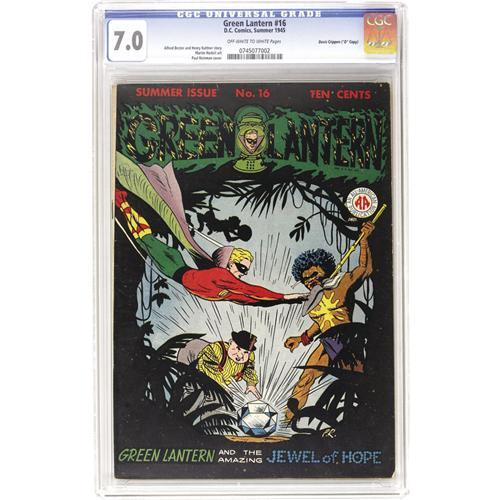 <B>Green Lantern #16 Davis Crippen ("D" Copy) pedigree (DC, 1945) CGC FN/VF 7.0 Off-white to white pages.</B></I> "Scarce in high grade" says Overstreet, and this book's not too plentiful in any other grade, either - we hadn't seen a copy in years. The classic jungle cover is by Paul Reinman. Overstreet 2006 FN 6.0 value = $477; VF 8.0 value = $994. CGC census 6/06: 1 in 7.0, 2 higher. <I>From the Crippen Collection.</B></I> <BR><BR><B>Important notice:</B> Heritage usually auctions material at the rate of 200-250 lots per hour. On some occasions eBay Live bid software or the Internet may not be able to keep up with the pace of the auction. We recommend placing a realistic absentee bid now as insurance to avoid disappointment. Occasionally the auctioneer may eliminate or reject an eBay Live bid, and the auctioneer may also reopen a lot after the close of the eBay live bidding (usually because we missed an audience bid), and may reject your bid even if it shows you as the winning bidder. By bidding via eBay Live, you agree that Heritage may award the lot to another bidder at its sole discretion under the circumstances described above or any other reasonable circumstances. Since eBay bids are not shown to us until we open the lot on the floor, we treat those bids just like floor bids. In most cases the floor responds before the eBay bid is presented to us, due to Internet lag time, so for consistency we have made it a policy that floor bids are always considered first over tie eBay live bids. Also please note that all Heritage lots purchased through eBay Live carry a 22.5% Buyer's Premium. Please make sure you read the Terms and Conditions before you bid. This lot is being auctioned in conjunction with a live floor auction by Heritage Auction Galleries. All final auction and invoice information will be supplied by Heritage Auction Galleries, and all other information should be considered preliminary. Lot:41001 <BR><BR><B>Winning Notification and Billing:</B> After the FINAL session in this auction is complete, Heritage will send e-mail and snail mail invoices. This process normally takes several days. All final auction and invoice information will be supplied by Heritage Auction Galleries, and all other information should be considered preliminary. <BR><BR>This auction will be conducted on a live auction floor and over the Internet through eBay Live. If you choose to place an absentee bid, please take a moment to <font color='#0000ff'><u><a href='http://pages.ebay.com/liveauctions/help/before/laabsentee.html'>learn how eBay Live absentee bidding works</a></u></font><font color='#000000'>