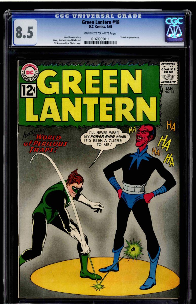 Green Lantern #18 CGC 8.5 off-white to white pages. "World Of Perilous Traps" Art by Gil Kane and Joe Giella. Art by Gil Kane - January 1963. Overstreet 2009 VF 8.0 value = $111; VF/NM 9.0 value = $206.The CGC universal census reports 1 at 8.5 and 2 higher.