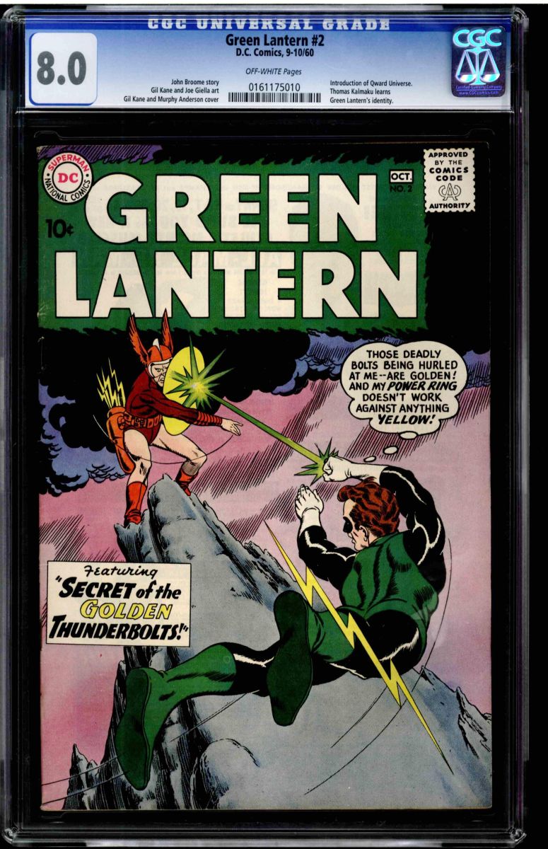 Green Lantern #2 CGC 8.0 off white pages. "Secret Of The Golden Thunderbolts" Written by John Broome, art by Gil Kane, cover by Murphy Anderson and Gil Kane, edited by Julius Schwartz. September/October 1960. Overstreet 2009 VF 8.0 value = $638. The CGC universal census reports 3 at 8.0 and 13 higher.