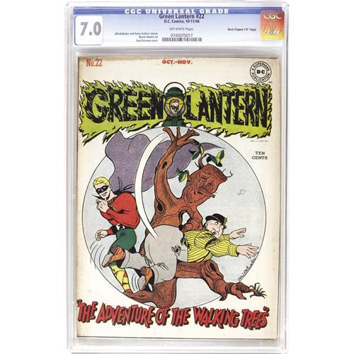 <B>Green Lantern #22 Davis Crippen ("D" Copy) pedigree (DC, 1946) CGC FN/VF 7.0 Off-white pages.</B></I> This cover's yuks are courtesy of Paul Reinman; Martin Nodell provided the interior art. Overstreet 2006 FN 6.0 value = $357; VF 8.0 value = $744. CGC census 7/06: 1 in 7.0, 3 higher. <I>From the Crippen Collection.</B></I> <BR><BR><B>Important notice:</B> Heritage usually auctions material at the rate of 200-250 lots per hour. On some occasions eBay Live bid software or the Internet may not be able to keep up with the pace of the auction. We recommend placing a realistic absentee bid now as insurance to avoid disappointment. Occasionally the auctioneer may eliminate or reject an eBay Live bid, and the auctioneer may also reopen a lot after the close of the eBay live bidding (usually because we missed an audience bid), and may reject your bid even if it shows you as the winning bidder. By bidding via eBay Live, you agree that Heritage may award the lot to another bidder at its sole discretion under the circumstances described above or any other reasonable circumstances. Since eBay bids are not shown to us until we open the lot on the floor, we treat those bids just like floor bids. In most cases the floor responds before the eBay bid is presented to us, due to Internet lag time, so for consistency we have made it a policy that floor bids are always considered first over tie eBay live bids. Also please note that all Heritage lots purchased through eBay Live carry a 22.5% Buyer's Premium. Please make sure you read the Terms and Conditions before you bid. This lot is being auctioned in conjunction with a live floor auction by Heritage Auction Galleries. All final auction and invoice information will be supplied by Heritage Auction Galleries, and all other information should be considered preliminary. Lot:41001 <BR><BR><B>Winning Notification and Billing:</B> After the FINAL session in this auction is complete, Heritage will send e-mail and snail mail invoices. This process normally takes several days. All final auction and invoice information will be supplied by Heritage Auction Galleries, and all other information should be considered preliminary. <BR><BR>This auction will be conducted on a live auction floor and over the Internet through eBay Live. If you choose to place an absentee bid, please take a moment to <font color='#0000ff'><u><a href='http://pages.ebay.com/liveauctions/help/before/laabsentee.html'>learn how eBay Live absentee bidding works</a></u></font><font color='#000000'>