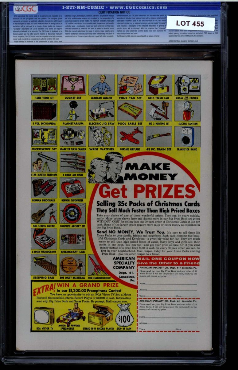 The Auctioneer has reserved the right to reject any and all bids, and to bid at the auction. Auctioneers Auctions are not on approval. Auctioneer does not allow certified material to be returned because of possible differences of opinion with respect to the grade offered by any third party organization, dealer, or service. Absolutely no guarantee of grade is offered for un-certified property sold and subsequently submitted to a third-party grading service. There will be no exceptions to this policy. Under extremely limited circumstances, (e.g. gross cataloging error) a purchaser, who did not bid from the floor, may request Auctioneer to evaluate voiding a sale; such request must be made in writing detailing the alleged gross error, and submission of the lot to the Auctioneer must be pre-approved by the Auctioneer. Bidder must notify Auctioneer in writing of such request within three (3) days of the non-floor bidder receipt of the lot. Any lot that is to be evaluated must be in our offices within 30 days after Auction. Grading does not qualify for this evaluation process nor do such complaints constitute a basis to challenge the authenticity of a lot. AFTER THAT 30-DAY PERIOD, NO LOTS MAY BE RETURNED FOR REASONS OTHER THAN AUTHENTICITY. Lots returned must be housed intact in the original holder. No lots purchased by floor Bidders may be returned (including those Bidders acting as agents for others). Late remittance for purchases may be considered just cause to revoke all return privileges. B: Auctions conducted solely on the Internet have a THREE (3) DAY RETURN POLICY: Lots paid for within seven days of the Auction closing are sold with a three (3) day return privilege. You may return lots under the following conditions: Within three days of receipt of the lot, you must first notify Auctioneer by contacting Client Service by phone (314-680-8599) or e-mail (moundcityauctions@gmail.com), and immediately mail the lot(s) fully insured to the attention of Returns, Mound City Auctions 1081 Teson Rd. Hazelwood, MO. 63042. Lots must be housed intact in their original holder and in their original condition. You are responsible for the insured, safe delivery of any lots. Auctioneer will not be responsible for lots returned in non-registered mail or lots returned without prior authorization per section B. A non-negotiable return fee of 5% of the purchase price ($10 per lot minimum) will be deducted from the refund for each returned lot or billed directly. Postage and handling fees are not refunded. After the three-day period (from receipt), no items may be returned for any reason. Late remittance for purchases revokes all Return-Restock privileges. C: Bidders who have inspected the lots prior to the auction will not be granted any return privileges. D: Comic books sold referencing a third-party grading service are sold “as is” without any express or implied warranty. Certain warranties may be available from the grading services and the Bidder is referred to them for further details: Certified Guaranty Company, LLC. (CGC), P.O. Box 4738, Sarasota, FL 34230. E: Bidders who intend to challenge authenticity or provenance of a lot must notify Auctioneer in writing within thirty (30) days of the Auctions conclusion. In the event Auctioneer cannot deliver the lot or subsequently it is established that the lot lacks title, provenance, authenticity, or other transfer or condition issue is claimed, Auctioneer's liability shall be limited to rescission of sale and refund of purchase price; in no case shall Auctioneer's maximum liability exceed the high bid on that lot, which bid shall be deemed for all purposes the value of the lot. After one year has elapsed, Auctioneer's maximum liability shall be limited to any commissions and fees Auctioneer earned on that lot. F: All comics are guaranteed genuine, but are not guaranteed as to grade, since grading is a matter of opinion, an art and not a science, and therefore the opinion rendered by the Auctioneer or any third party grading service may not agree with the opinion of others (including trained experts), and the same expert may not grade the same item with the same grade at two different times. G: Since we cannot examine encapsulated comics, they are sold “as is”without our grading opinion, and may not be returned for any reason. Auctioneer shall not be liable for any patent or latent defect or controversy pertaining to or arising from any encapsulated collectible. In any such instance, purchaser's remedy, if any, shall be solely against the service certifying the collectible. H: Due to changing grading standards over time, differing interpretations, and to possible mishandling of items by subsequent owners, Auctioneer reserves the right to grade items differently than shown on certificates from any grading service that accompany the items. Auctioneer also reserves the right to grade items differently than the grades shown in the prior catalog should such items be reconsigned to any future auction. I: Although consensus grading is employed by most grading services, it should be noted as aforesaid that grading is not an exact science. In fact, it is entirely possible that if a lot is broken out of a plastic holder and resubmitted to another grading service or even to the same service, the lot could come back with a different grade assigned. J: Certification does not guarantee protection against the normal risks associated with potentially volatile markets. The degree of liquidity for certified collectibles will vary according to general market conditions and the particular lot involved. For some lots there may be no active market at all at certain points in time."