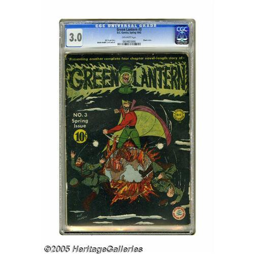 <B>Green Lantern #3 (DC, 1942) CGC GD/VG 3.0 Off-white pages.</B></I> This issue's Martin Nodell cover earned Overstreet's ""classic"" designation. All of the interior art is also by Nodell, the character's creator. Overstreet 2005 GD 2.0 value = $484; VG 4.0 value = $968. CGC census 9/05: 1 in 3.0, 8 higher. <BR><BR><B>Important notice:</B> Heritage usually auctions material at the rate of 200-250 lots per hour. On some occasions eBay Live bid software or the Internet may not be able to keep up with the pace of the auction. We recommend placing a realistic absentee bid now as insurance to avoid disappointment. Occasionally the auctioneer may eliminate or reject an eBay Live bid, and the auctioneer may also reopen a lot after the close of the eBay live bidding (usually because we missed an audience bid), and may reject your bid even if it shows you as the winning bidder. By bidding via eBay Live, you agree that Heritage may award the lot to another bidder at its sole discretion under the circumstances described above or any other reasonable circumstances. Since eBay bids are not shown to us until we open the lot on the floor, we treat those bids just like floor bids. In most cases the floor responds before the eBay bid is presented to us, due to Internet lag time, so for consistency we have made it a policy that floor bids are always considered first over tie eBay live bids. Also please note that all Heritage lots purchased through eBay Live carry a 20% Buyer's Premium. Please make sure you read the Terms and Conditions before you bid. This lot is being auctioned in conjunction with a live floor auction by Heritage Galleries & Auctioneers. All final auction and invoice information will be supplied by Heritage Galleries & Auctioneers, and all other information should be considered preliminary. Lot:2151 <BR><BR><B>Winning Notification and Billing:</B> After the FINAL session in this auction is complete, Heritage will send e-mail and snail mail invoices. This process n