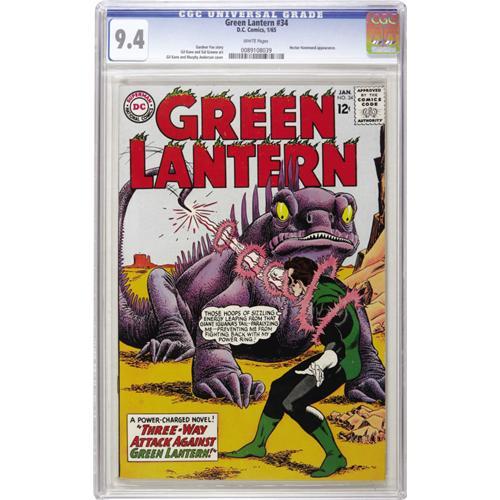 <B>Green Lantern #34 (DC, 1965) CGC NM 9.4 White pages.</B></I> Big-brained Hector Hammond is the foe of the issue for Green Lantern. Gil Kane handled art chores on the cover and the interior. Overstreet 2006 NM- 9.2 value = $165. CGC census 10/06: 4 in 9.4, 2 higher.<BR><BR><b>Shipping:</b> Slabbed Comic (<a target="_blank" href="http://www.heritageauctions.com/common/shipping.php">view shipping information</a>)