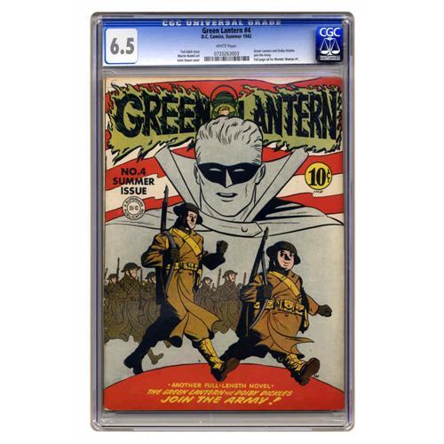 <B>Green Lantern #4 (DC, 1942) CGC FN+ 6.5 White pages.</B></I> Like most early issues of the Golden Age GL, nice copies are hard to come by. At FN+ 6.5, our offering surprisingly is bested by just four other in CGC's current census, only two of which are better than VF- 7.5. Green Lantern and Doiby Dickles joined the Army in this issue. The book has an Irwin Hasen cover and Martin Nodell interior art. Overstreet 2005 FN 6.0 value = $1,200; VF 8.0 value = $2,600. CGC census 11/05: 3 in 6.5, 4 higher.