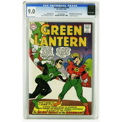 <B>Green Lantern #40 (DC, 1965) CGC VF/NM 9.0 Off-white to white pages.</B></I> Attention <B>Crisis</B></I> fans: the origin of the DC Universe's infinite Earths was right here in this issue, providing the foundation for much that was to come in the DC Universe. And the story also reveals the origin of the Guardians, and has the first appearance of Krona. And speaking of multiple Earths, the Green Lantern of Earth-Two (i.e. the Golden Age GL) guest stars, the first time he made a full appearance in this Silver Age series. Doiby Dickles also appears. The issue's cover and art are by Gil Kane. Overstreet 2005 VF/NM 9.0 value = $572; NM- 9.2 value = $775. CGC census 12/05: 14 in 9.0, 24 higher.