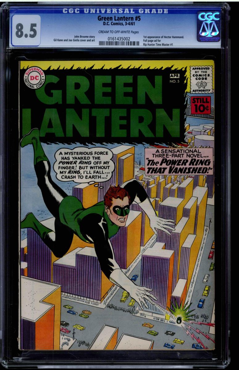 Green Lantern #5 CGC 8.5 cream to off-white pages. March/April 1961. 1st appearance of Hector Hammond, full page ad for Rip Hunter Time Master #1. Overstreet 2009 VF 8.0 value = $286; VF/NM 9.0 value = $536. The CGC universal census reports 5 at 8.5 and 9 higher. Another top notch book.