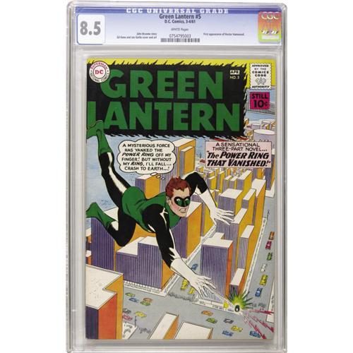 <B>Green Lantern #5 (DC, 1961) CGC VF+ 8.5 White pages.</B></I>This issue's got the debut of Hector Hammond, in what was the beginning of a long and productive baddie career. The cover art is by Gil Kane. Overstreet 2006 VF 8.0 value = $285; VF/NM 9.0 value = $468. CGC census 10/06: 2 in 8.5, 6 higher.<BR><BR><b>Shipping:</b> Slabbed Comic (<a target="_blank" href="http://www.heritageauctions.com/common/shipping.php">view shipping information</a>)