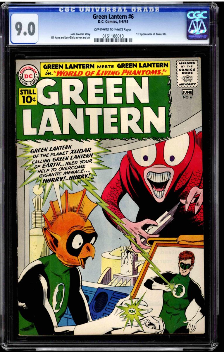 Green Lantern #6 CGC 9.0 off-white to white pages. First appearance of Tomar-Re May/June 1961. Overstreet 2009 VF/NM 9.0 value = $477. The CGC universal census reports The CGC universal census reports 3 at 9.0 and 2 higher, making this a top 6 book. Looks like another fantastic find for Green Lantern Collectors.