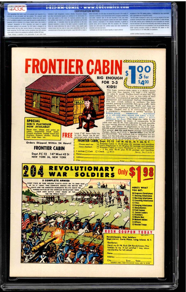 The Auctioneer has reserved the right to reject any and all bids, and to bid at the auction. Auctioneers Auctions are not on approval. Auctioneer does not allow certified material to be returned because of possible differences of opinion with respect to the grade offered by any third party organization, dealer, or service. Absolutely no guarantee of grade is offered for un-certified property sold and subsequently submitted to a third-party grading service. There will be no exceptions to this policy. Under extremely limited circumstances, (e.g. gross cataloging error) a purchaser, who did not bid from the floor, may request Auctioneer to evaluate voiding a sale; such request must be made in writing detailing the alleged gross error, and submission of the lot to the Auctioneer must be pre-approved by the Auctioneer. Bidder must notify Auctioneer in writing of such request within three (3) days of the non-floor bidder receipt of the lot. Any lot that is to be evaluated must be in our offices within 30 days after Auction. Grading does not qualify for this evaluation process nor do such complaints constitute a basis to challenge the authenticity of a lot. AFTER THAT 30-DAY PERIOD, NO LOTS MAY BE RETURNED FOR REASONS OTHER THAN AUTHENTICITY. Lots returned must be housed intact in the original holder. No lots purchased by floor Bidders may be returned (including those Bidders acting as agents for others). Late remittance for purchases may be considered just cause to revoke all return privileges. B: Auctions conducted solely on the Internet have a THREE (3) DAY RETURN POLICY: Lots paid for within seven days of the Auction closing are sold with a three (3) day return privilege. You may return lots under the following conditions: Within three days of receipt of the lot, you must first notify Auctioneer by contacting Client Service by phone (314-680-8599) or e-mail (moundcityauctions@gmail.com), and immediately mail the lot(s) fully insured to the attention of Returns, Mound City Auctions 1081 Teson Rd. Hazelwood, MO. 63042. Lots must be housed intact in their original holder and in their original condition. You are responsible for the insured, safe delivery of any lots. Auctioneer will not be responsible for lots returned in non-registered mail or lots returned without prior authorization per section B. A non-negotiable return fee of 5% of the purchase price ($10 per lot minimum) will be deducted from the refund for each returned lot or billed directly. Postage and handling fees are not refunded. After the three-day period (from receipt), no items may be returned for any reason. Late remittance for purchases revokes all Return-Restock privileges. C: Bidders who have inspected the lots prior to the auction will not be granted any return privileges. D: Comic books sold referencing a third-party grading service are sold “as is” without any express or implied warranty. Certain warranties may be available from the grading services and the Bidder is referred to them for further details: Certified Guaranty Company, LLC. (CGC), P.O. Box 4738, Sarasota, FL 34230. E: Bidders who intend to challenge authenticity or provenance of a lot must notify Auctioneer in writing within thirty (30) days of the Auctions conclusion. In the event Auctioneer cannot deliver the lot or subsequently it is established that the lot lacks title, provenance, authenticity, or other transfer or condition issue is claimed, Auctioneer's liability shall be limited to rescission of sale and refund of purchase price; in no case shall Auctioneer's maximum liability exceed the high bid on that lot, which bid shall be deemed for all purposes the value of the lot. After one year has elapsed, Auctioneer's maximum liability shall be limited to any commissions and fees Auctioneer earned on that lot. F: All comics are guaranteed genuine, but are not guaranteed as to grade, since grading is a matter of opinion, an art and not a science, and therefore the opinion rendered by the Auctioneer or any third party grading service may not agree with the opinion of others (including trained experts), and the same expert may not grade the same item with the same grade at two different times. G: Since we cannot examine encapsulated comics, they are sold “as is”without our grading opinion, and may not be returned for any reason. Auctioneer shall not be liable for any patent or latent defect or controversy pertaining to or arising from any encapsulated collectible. In any such instance, purchaser's remedy, if any, shall be solely against the service certifying the collectible. H: Due to changing grading standards over time, differing interpretations, and to possible mishandling of items by subsequent owners, Auctioneer reserves the right to grade items differently than shown on certificates from any grading service that accompany the items. Auctioneer also reserves the right to grade items differently than the grades shown in the prior catalog should such items be reconsigned to any future auction. I: Although consensus grading is employed by most grading services, it should be noted as aforesaid that grading is not an exact science. In fact, it is entirely possible that if a lot is broken out of a plastic holder and resubmitted to another grading service or even to the same service, the lot could come back with a different grade assigned. J: Certification does not guarantee protection against the normal risks associated with potentially volatile markets. The degree of liquidity for certified collectibles will vary according to general market conditions and the particular lot involved. For some lots there may be no active market at all at certain points in time."