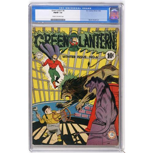<B>Green Lantern #6 (DC, 1942) CGC FN/VF 7.0 Cream to off-white pages.</B></I> Alan Scott, the original Green Lantern and an enduring character in the DCU to this day, leaps into action on this Irwin Hasen cover. Interior art by Martin Nodell. This is the highest-graded issue certified by CGC to date. Overstreet 2006 FN 6.0 value = $699; VF 8.0 value = $1,488. CGC census 3/07: 1 in 7.0, none higher.<BR><BR><b>Shipping:</b> Comics - Slabbed (certified) (<a target="_blank" href="http://www.heritageauctions.com/common/shipping.php">view shipping information</a>)