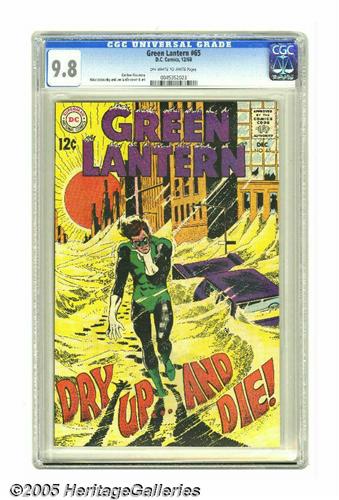 <B>Green Lantern #65 (DC, 1968) CGC NM/MT 9.8 Off-white to white pages.</B></I> This is a near-perfect copy of this Silver Age GL issue, which has a Mike Sekowsky cover and Sekowsky art as well. Overstreet 2005 NM- 9.2 value = $75. CGC census 2/05: 2 in 9.8, none higher.