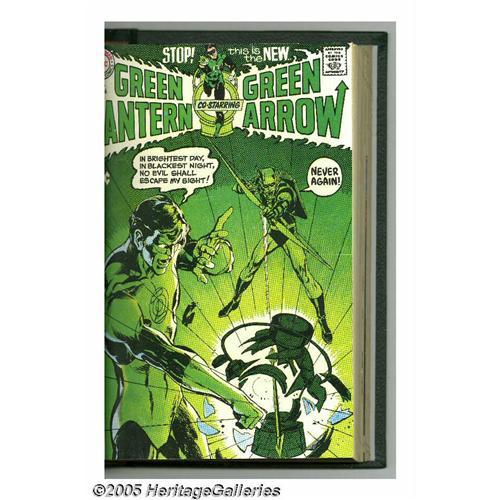 <B>Green Lantern #76-89 Bound Volume (DC, 1970-72).</B></I> Contains trimmed and bound copies of issues #76-89 (the entire Neal Adams run). Includes card signed by Adams. Spine of book is embossed with the title and issue numbers. Previous owner's name is embossed on the front of the book. Overstreet 2005 VG 4.0 value for group = $256. <BR><BR><B>Important notice:</B> Heritage usually auctions material at the rate of 200-250 lots per hour. On some occasions eBay Live bid software or the Internet may not be able to keep up with the pace of the auction. We recommend placing a realistic absentee bid now as insurance to avoid disappointment. Occasionally the auctioneer may eliminate or reject an eBay Live bid, and the auctioneer may also reopen a lot after the close of the eBay live bidding (usually because we missed an audience bid), and may reject your bid even if it shows you as the winning bidder. By bidding via eBay Live, you agree that Heritage may award the lot to another bidder at its sole discretion under the circumstances described above or any other reasonable circumstances. Since eBay bids are not shown to us until we open the lot on the floor, we treat those bids just like floor bids. In most cases the floor responds before the eBay bid is presented to us, due to Internet lag time, so for consistency we have made it a policy that floor bids are always considered first over tie eBay live bids. Also please note that all Heritage lots purchased through eBay Live carry a 20% Buyer's Premium. Please make sure you read the Terms and Conditions before you bid. This lot is being auctioned in conjunction with a live floor auction by Heritage Galleries & Auctioneers. All final auction and invoice information will be supplied by Heritage Galleries & Auctioneers, and all other information should be considered preliminary. Lot:3319 <BR><BR><B>Winning Notification and Billing:</B> After the FINAL session in this auction is complete, Heritage will send e-mail and snail ma