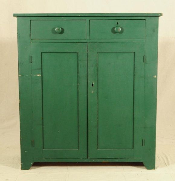 Green painted 2 door 2 drawer cupboard. 17 1/2" deep x 44" wide x 48 1/4" tall.