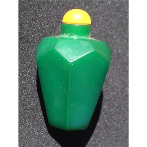 Green Peking glass snuff bottle with a geometric design. An yellow Peking glass stopper complements this exquisite pate du verre art glass snuff bottle. Height: 2.8" (7 cm.). Estimated retail value: $650.