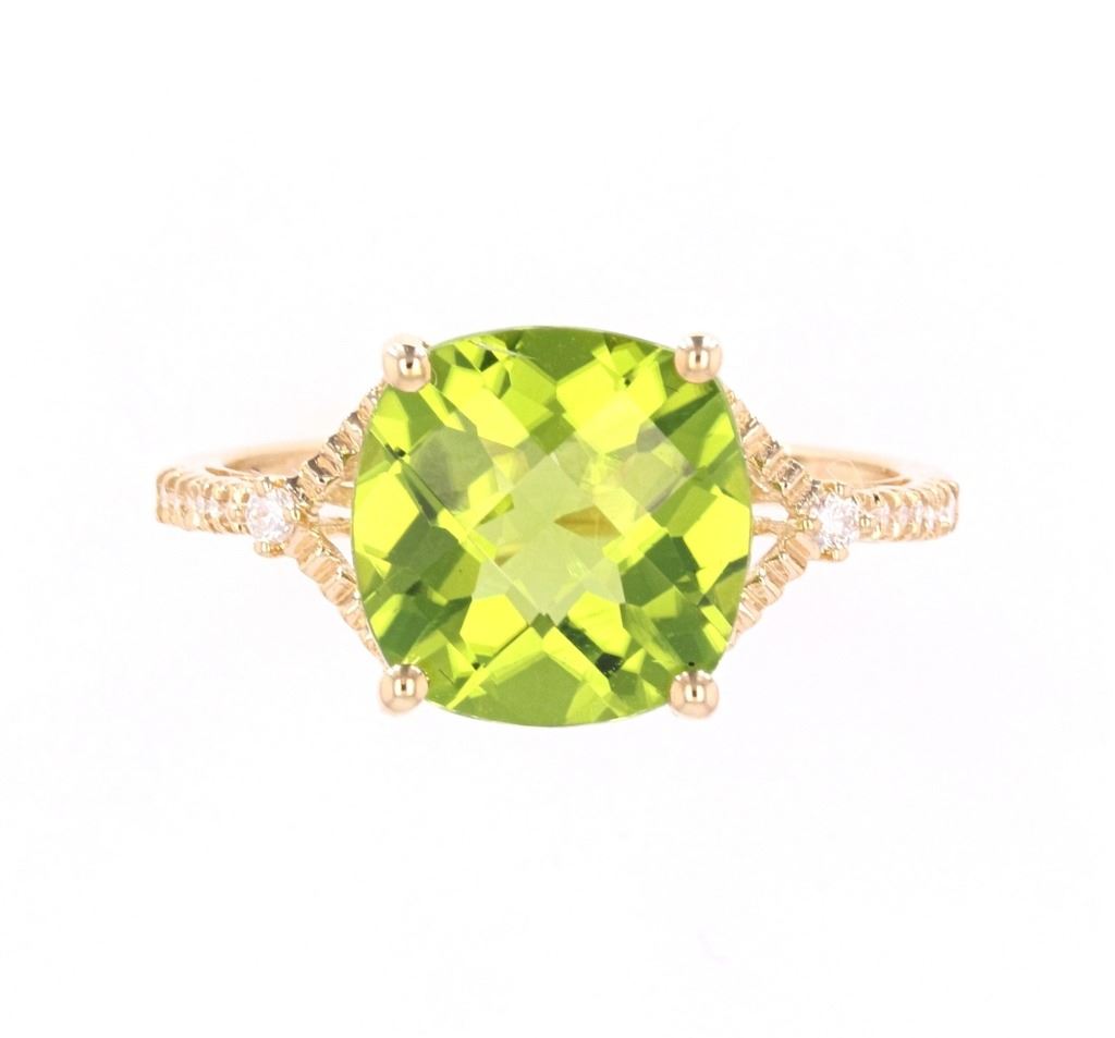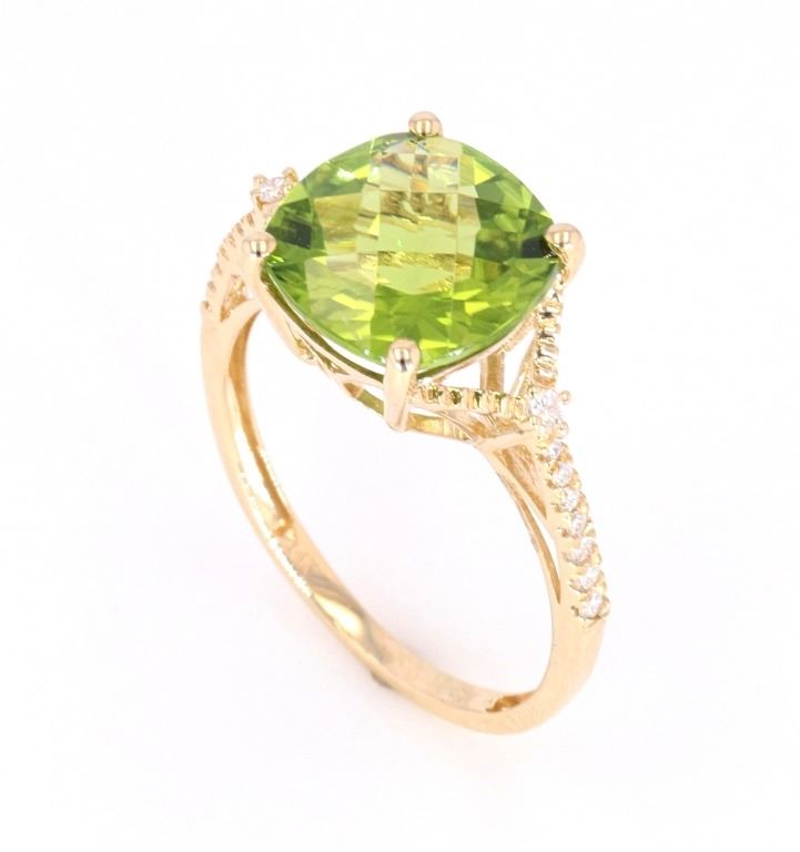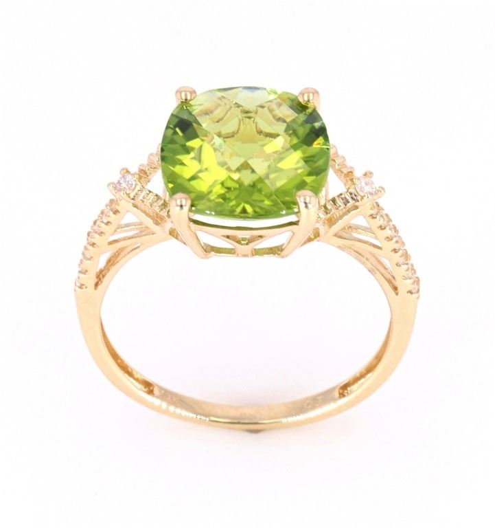 Offered in this lot is a beautiful Peridot natural stone set with Diamonds in a 14K gold ring. The center of the ring exhibits a prong set cushion mixed cut Peridot stone with large 4.13 carat size, bright green coloring and nice eye clarity. The ring also shows 16 round brilliant cut Diamonds with a weight of 0.11 carats on a 14 karat yellow gold setting. This shows a size of 7 US and weight of 1.69 grams.