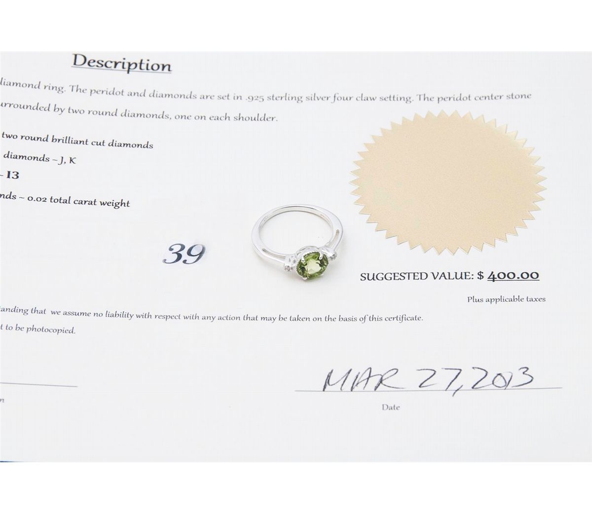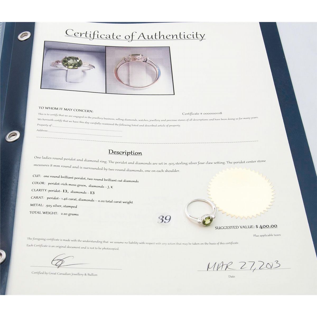 Includes 400 Certificate