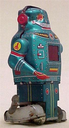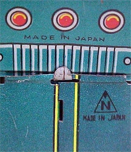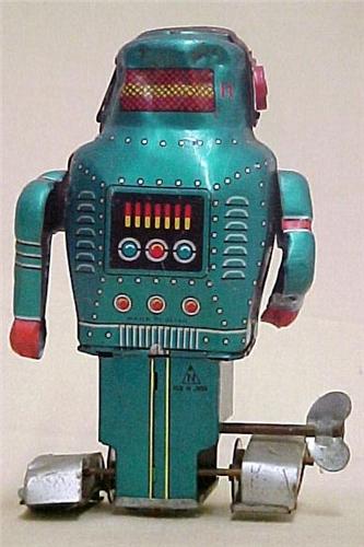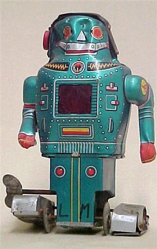 Green Robot; tin wind-up toy; working condition; marked N & Made in Japan; 5" high; head has dents on head and right hand; initials written in marker on left foot;