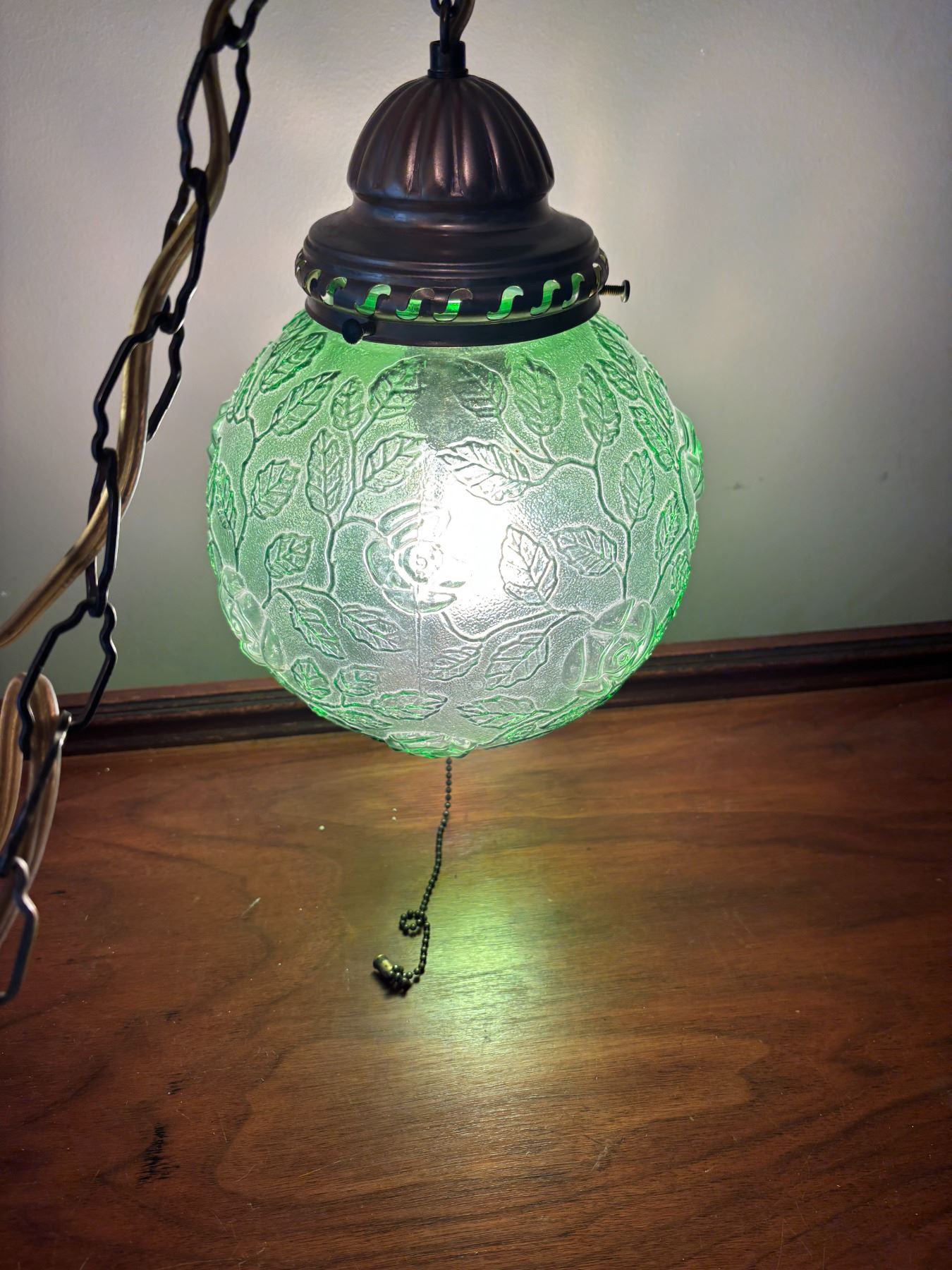 Green textured globe, 8” in diameter, gold base and chain, chain in great condition,