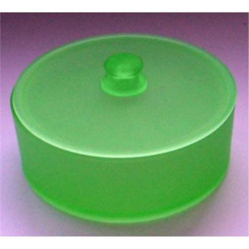 Produced circa 1930s this green satin or frosted Depression glass large powder, dresser or candy jar measures 6 1/2 inches in diameter, stands 3 1/2 inches tall to the top of its finial, is entirely in excellent condition and glows under black light.