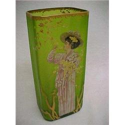 Green satin glass vase in rectangular form, hand painted gilt rim over enameled painting of a woman smelling flowers on front, floral and branch decoration on sides and back, 9 3/4" h., unmarked