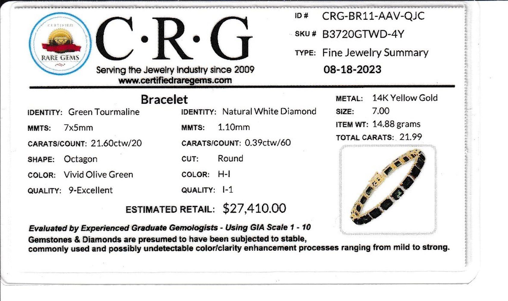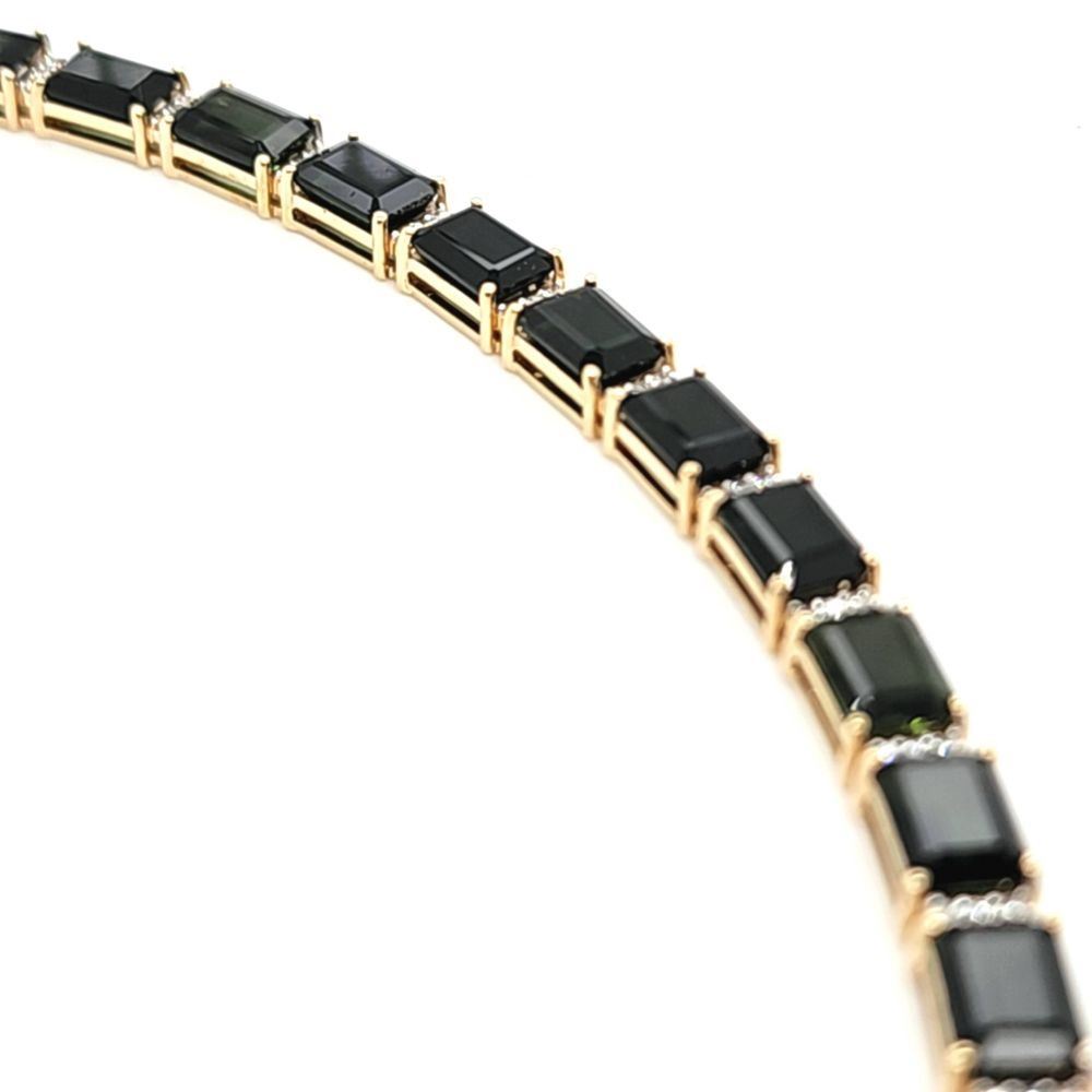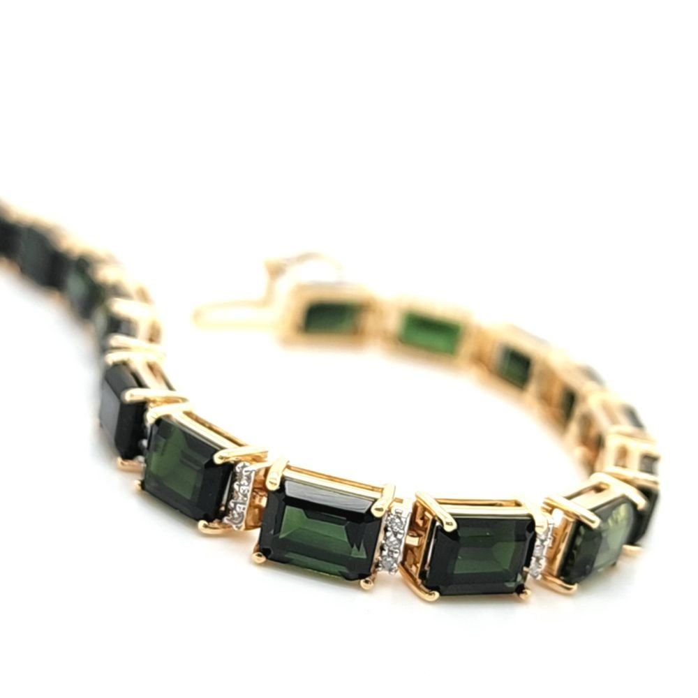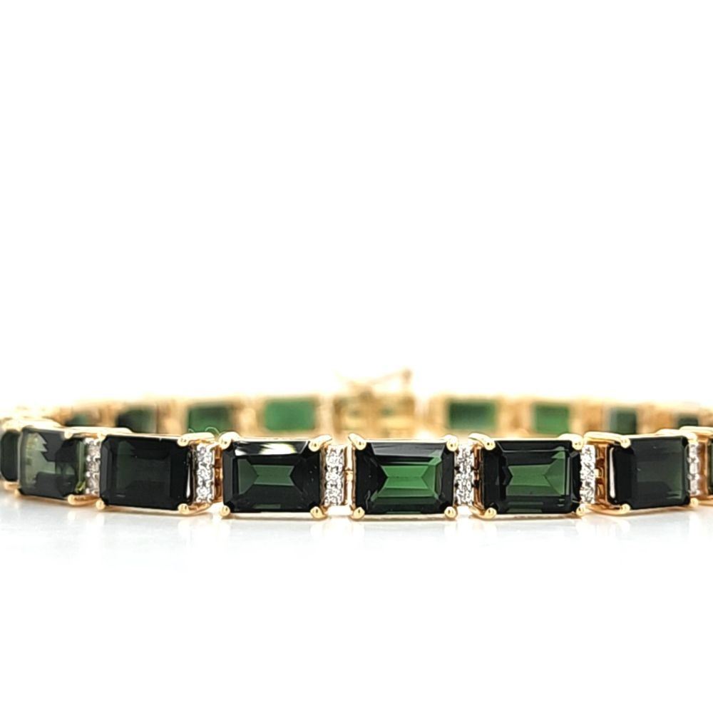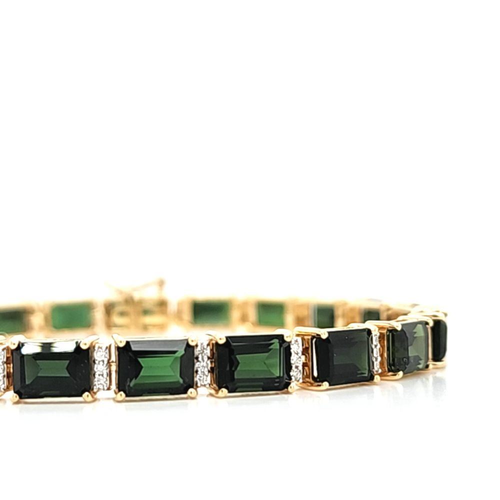 DESCRIPTION DETAIL: Genuine Green Tourmaline and Earth-Mined Diamond Bracelet. This is a& nbsp; yellow gold bracelet that features 21.60 carats of octagon-cut, prong-set, deep green tourmaline with .39 carats of round, brilliant-cut, H-I color, I1 clarity diamonds to separate the shiny gemstones. The bracelet is 7& quot; long, approximately 5 mm wide, and has a hidden box clasp with a safety clip. The clip is secure and very firm*.& nbsp;